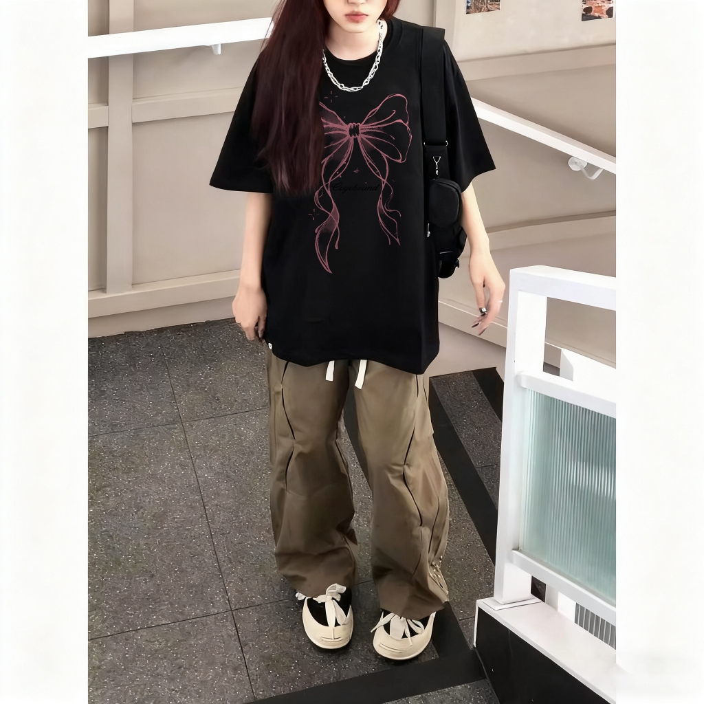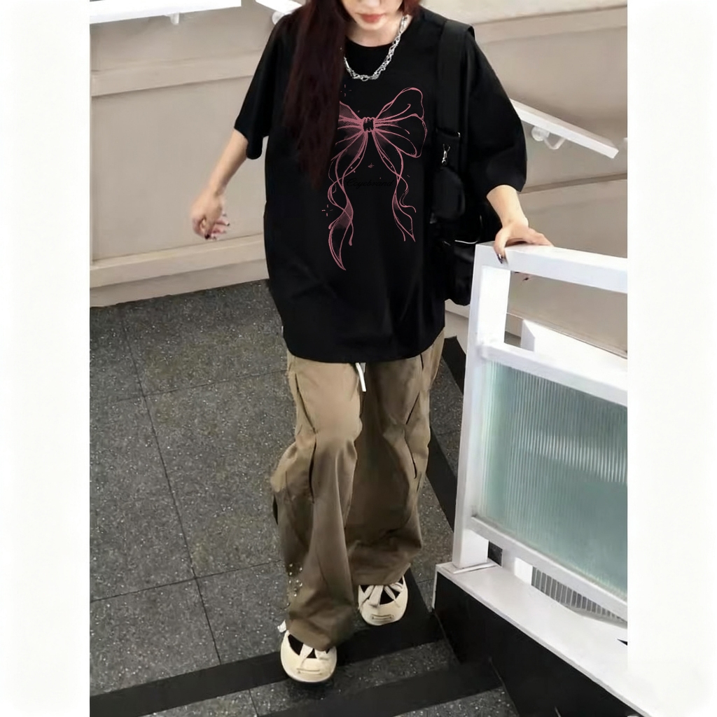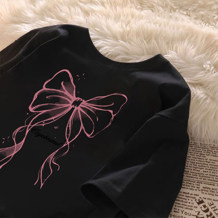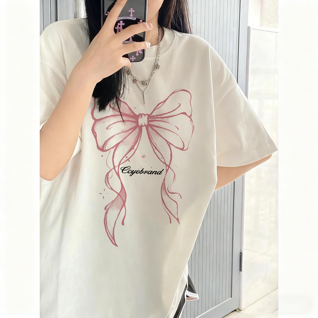 kumikumi Korean classic aesthetic shirt round neck T-shirt for women oversized Pink bow print