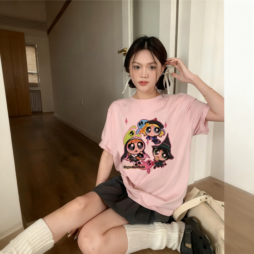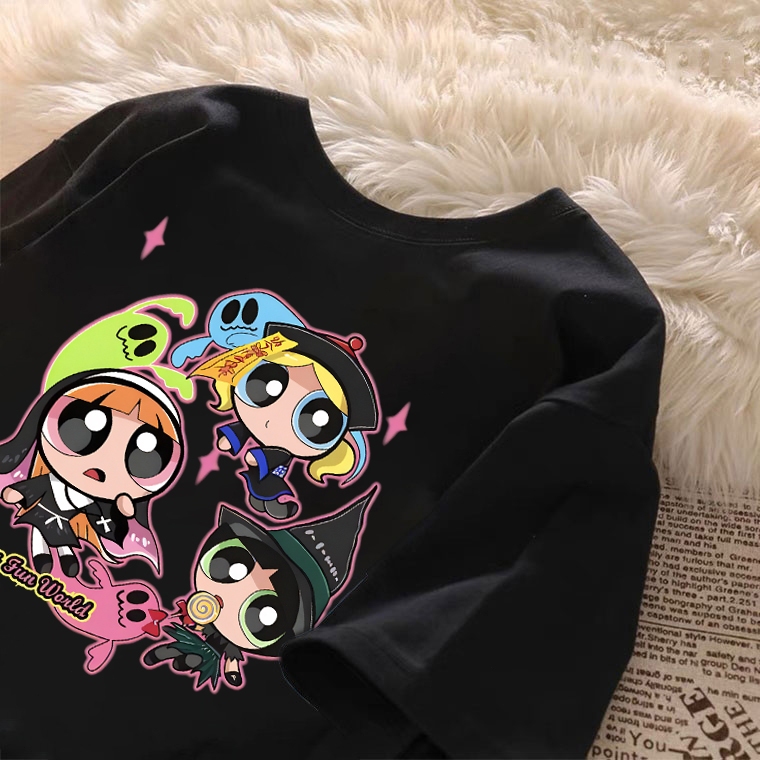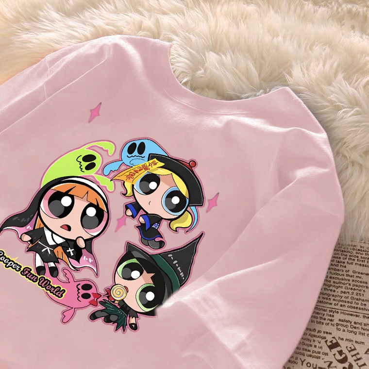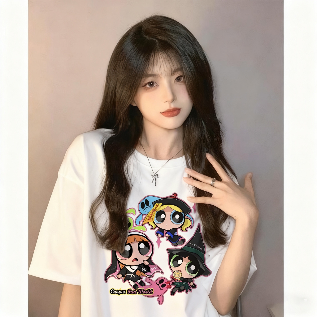 kumikumi Korean cute aesthetic shirt round neck T-shirt for women oversized Powerpuff Girls print