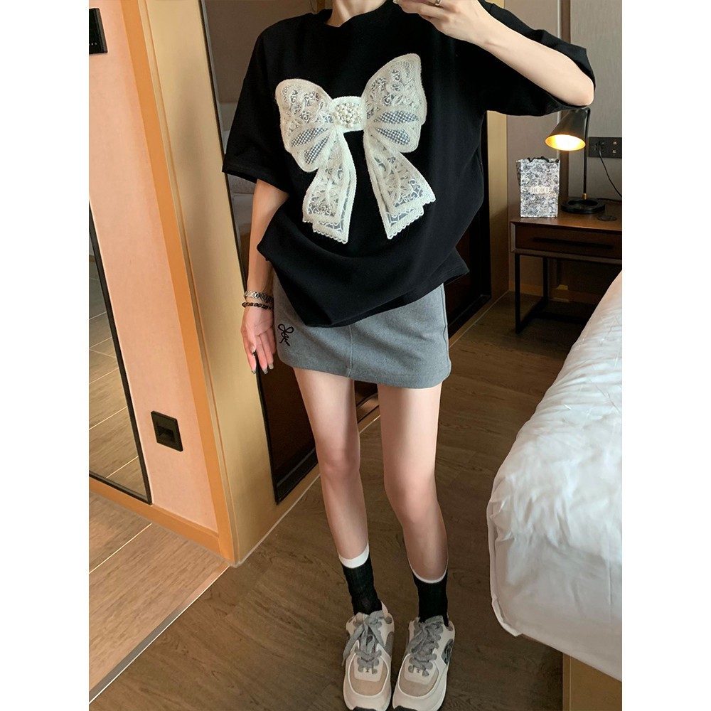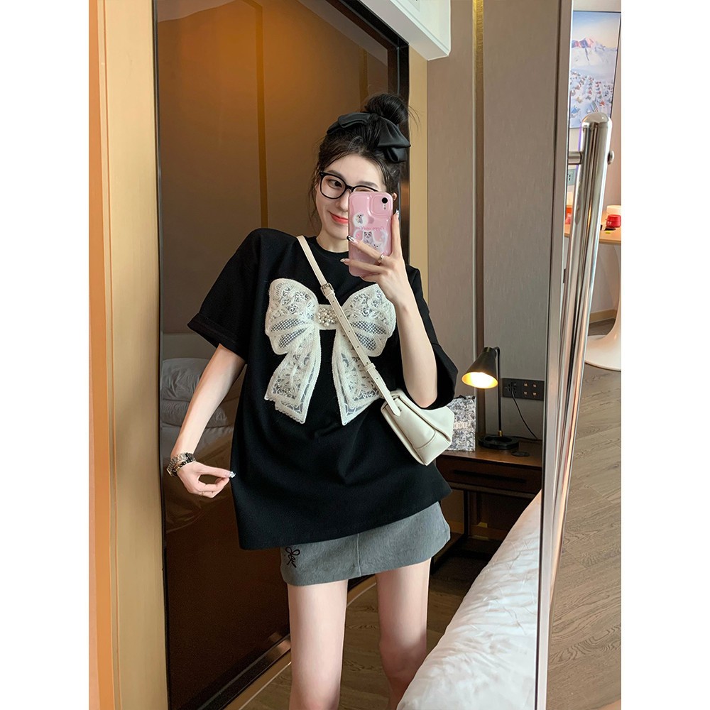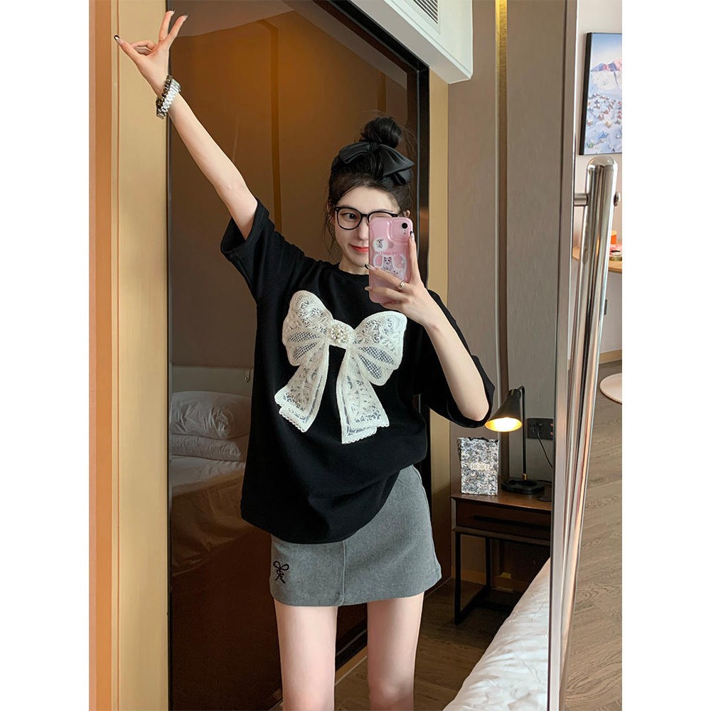 kumikumi Korean fashion women's T-shirt Lace bow print Oversized Casual Top