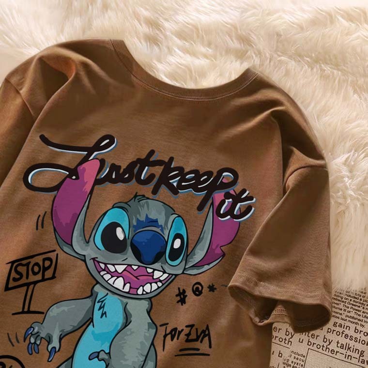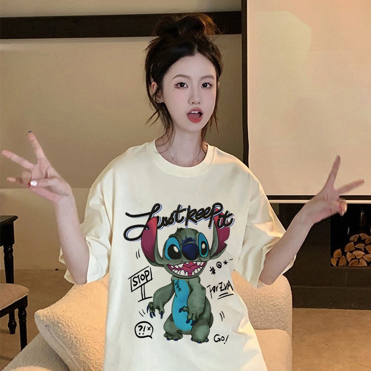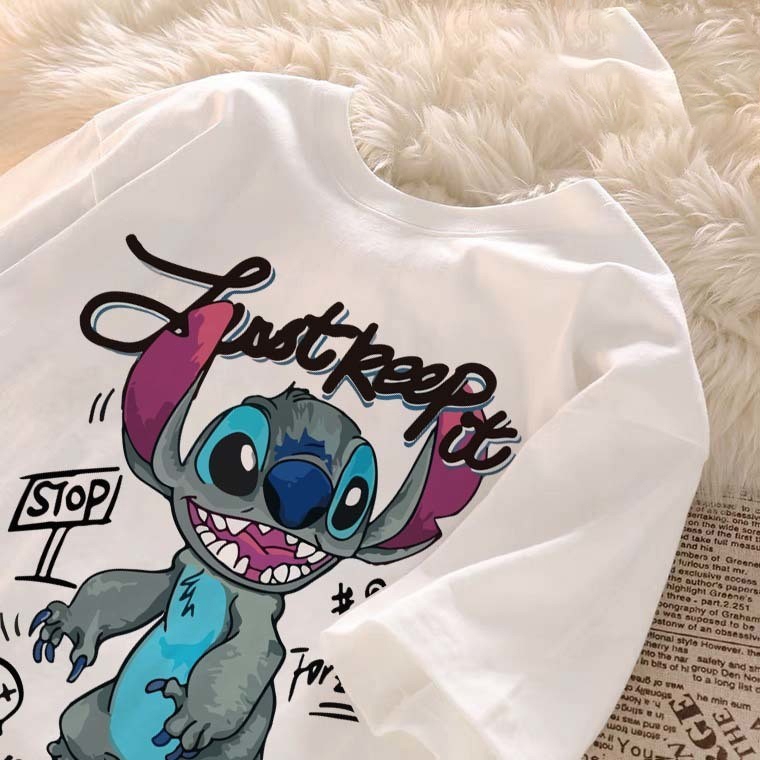 kumikumi Korean retro pure cotton cute Stitch print white oversized T-shirt for women