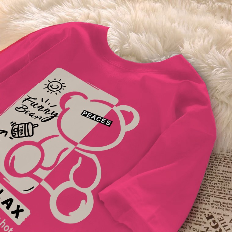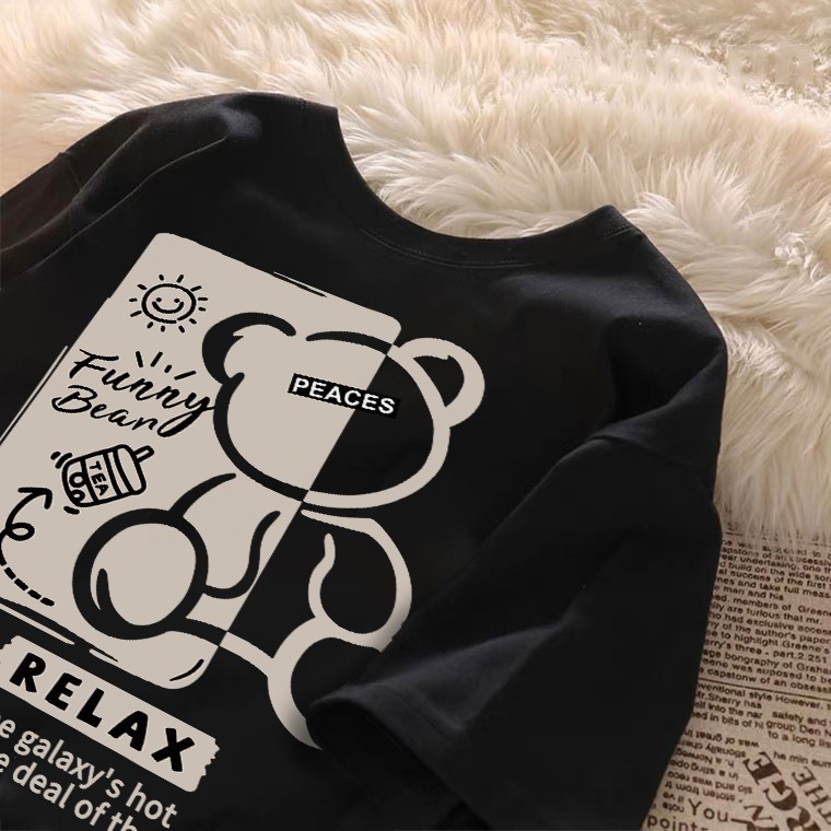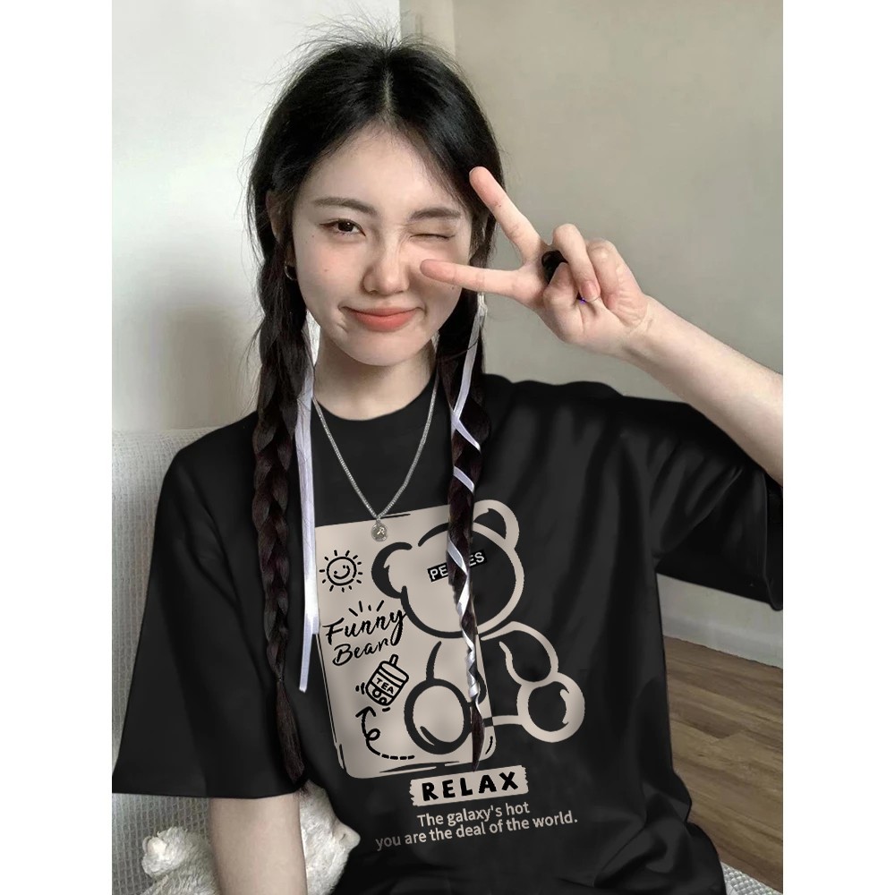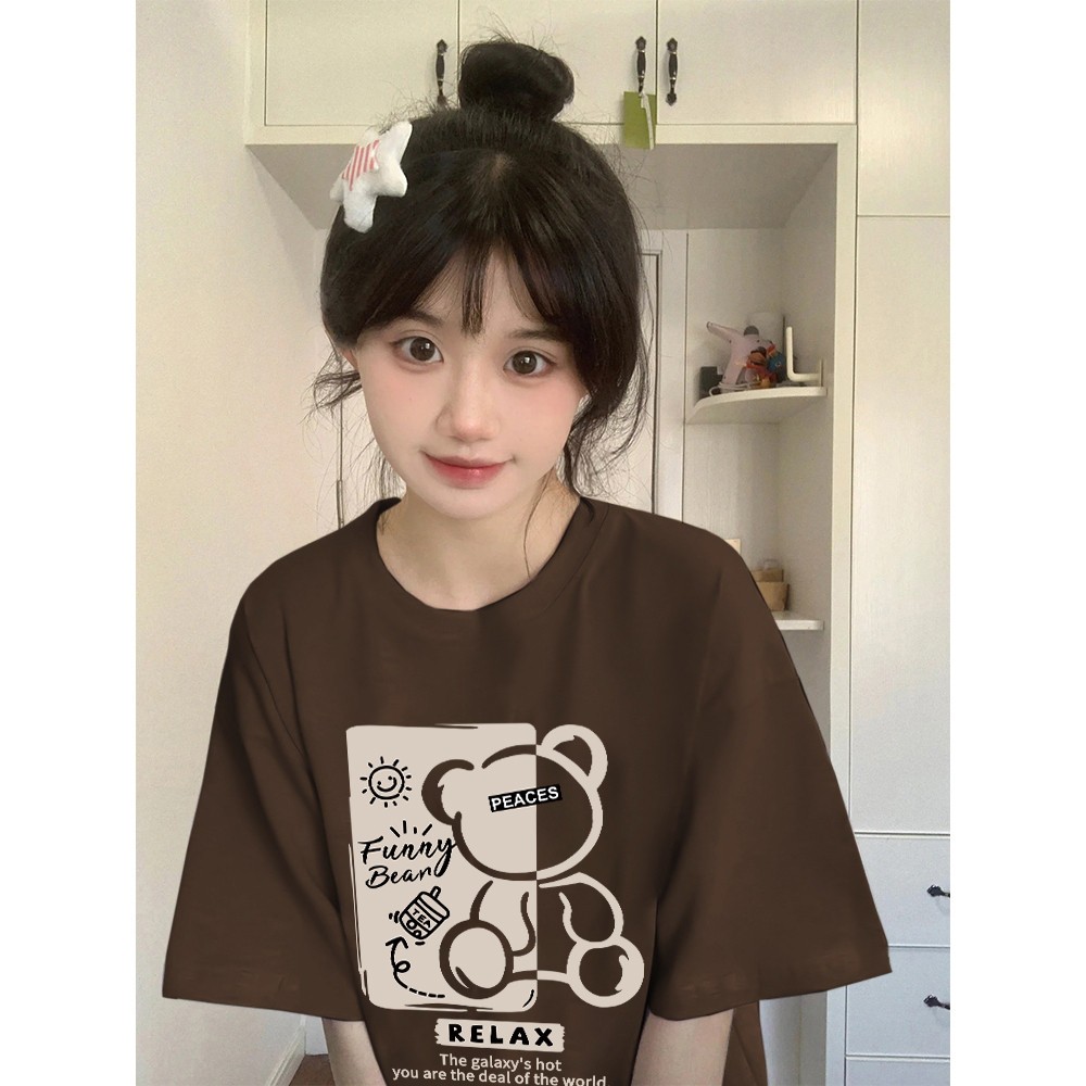 kumikumi Korean retro Relax Bear print oversized loose brown T-shirt for women