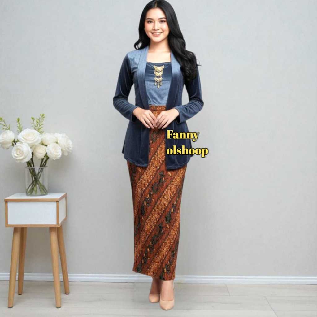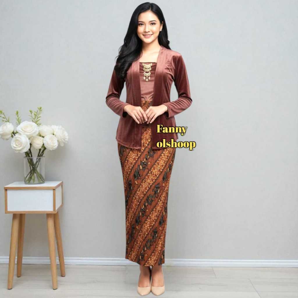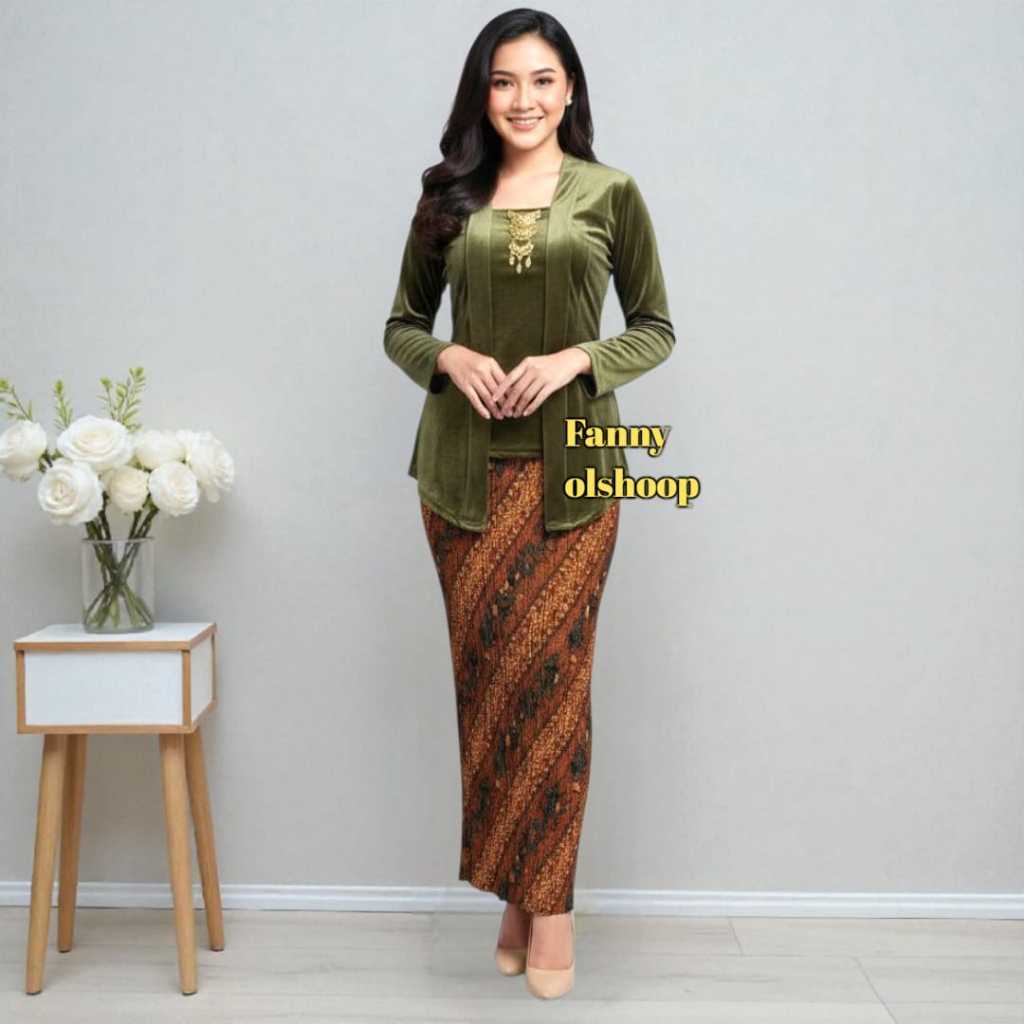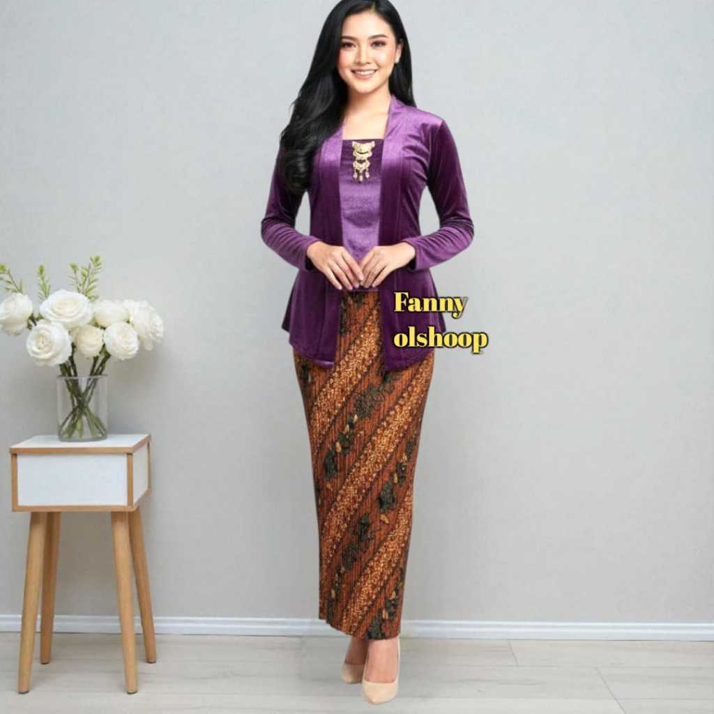 Kutubaru Silver Velvet Kebaya, Cool Stretch Material, TRADITIONAL JAVANESE SET [KEBAYA + SKIRT]