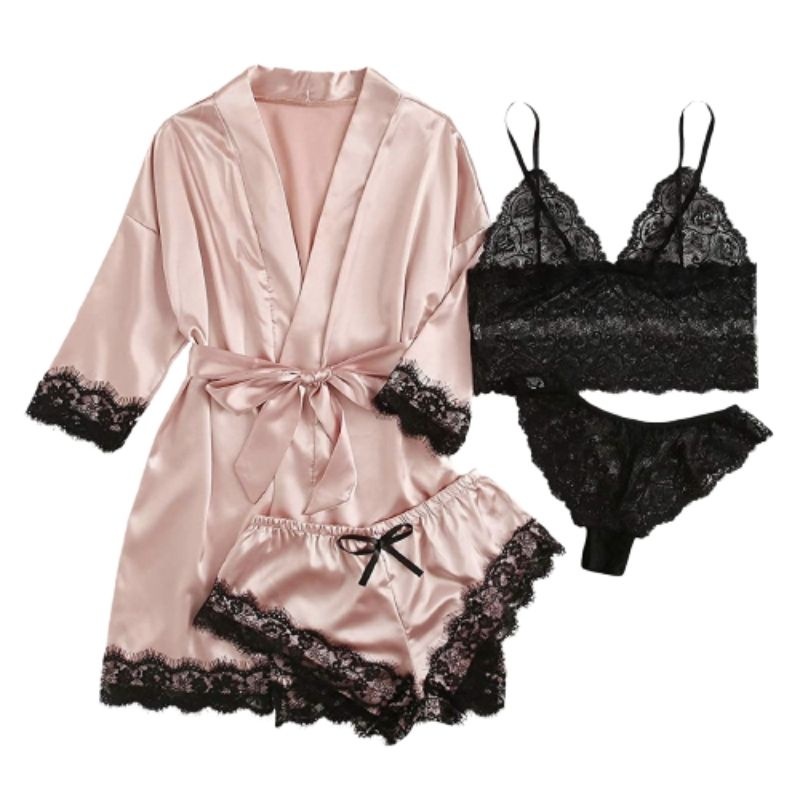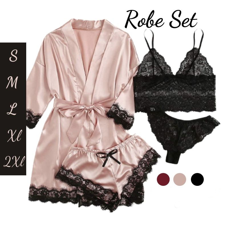 Lingerie Robe Set 4 Pcs Satin Camisole Set Sexy Lingerie Sexy Sleepwear Sleep Dress Baju Tidur Wanita S-2XL 睡袍吊带套装