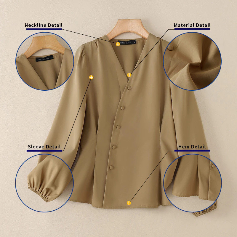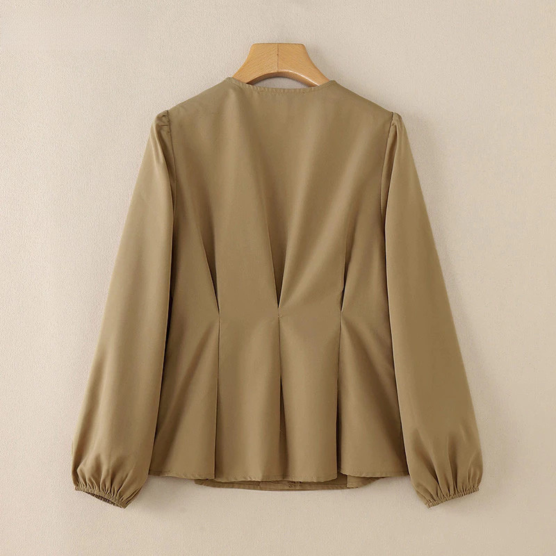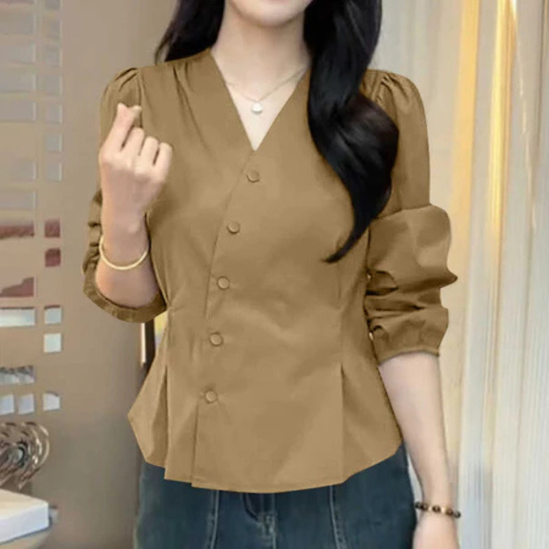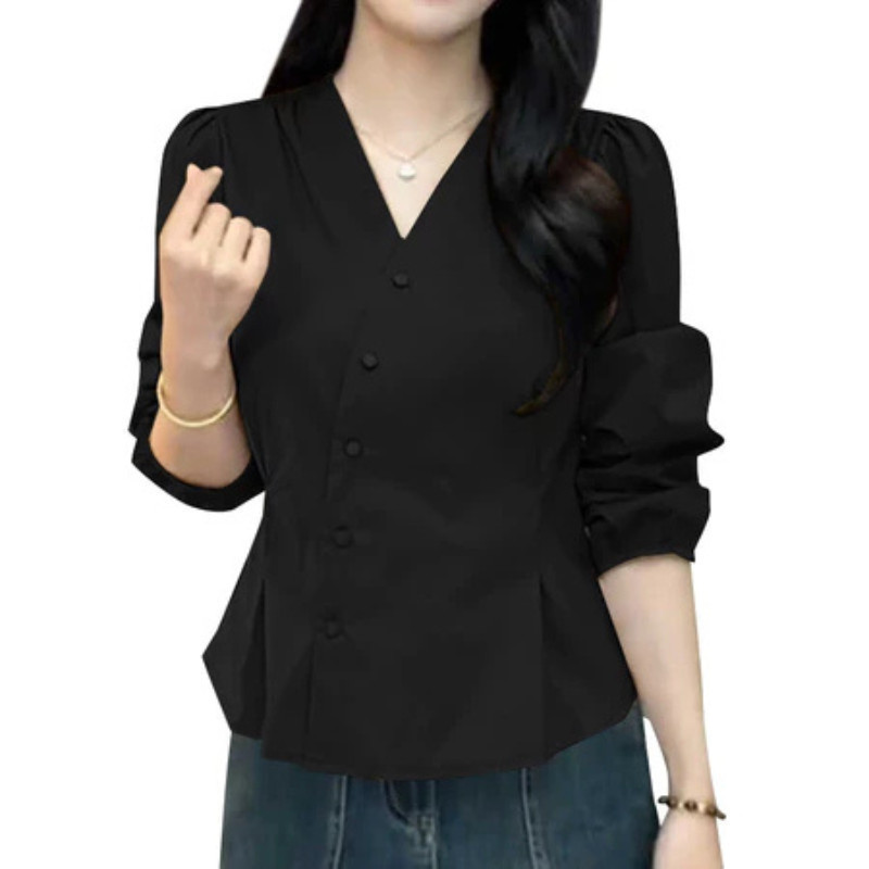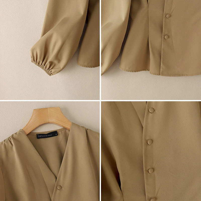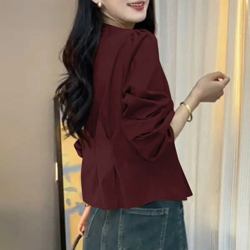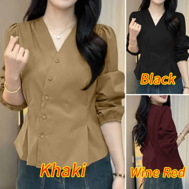 ?Linyufeng? Blouse Women Korean Style Casual Elegant V Neck Plain Long Sleeve Lantern Pleated Shirt Baju ootd Kemeja Lengan Panjang Perempuan Wanita Murah Ready Stock