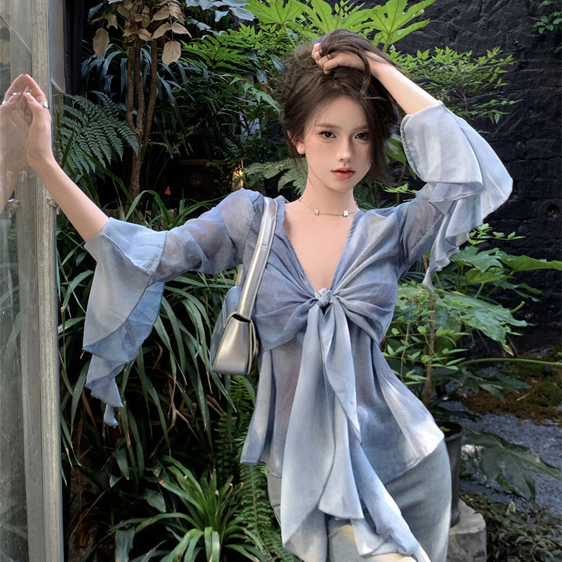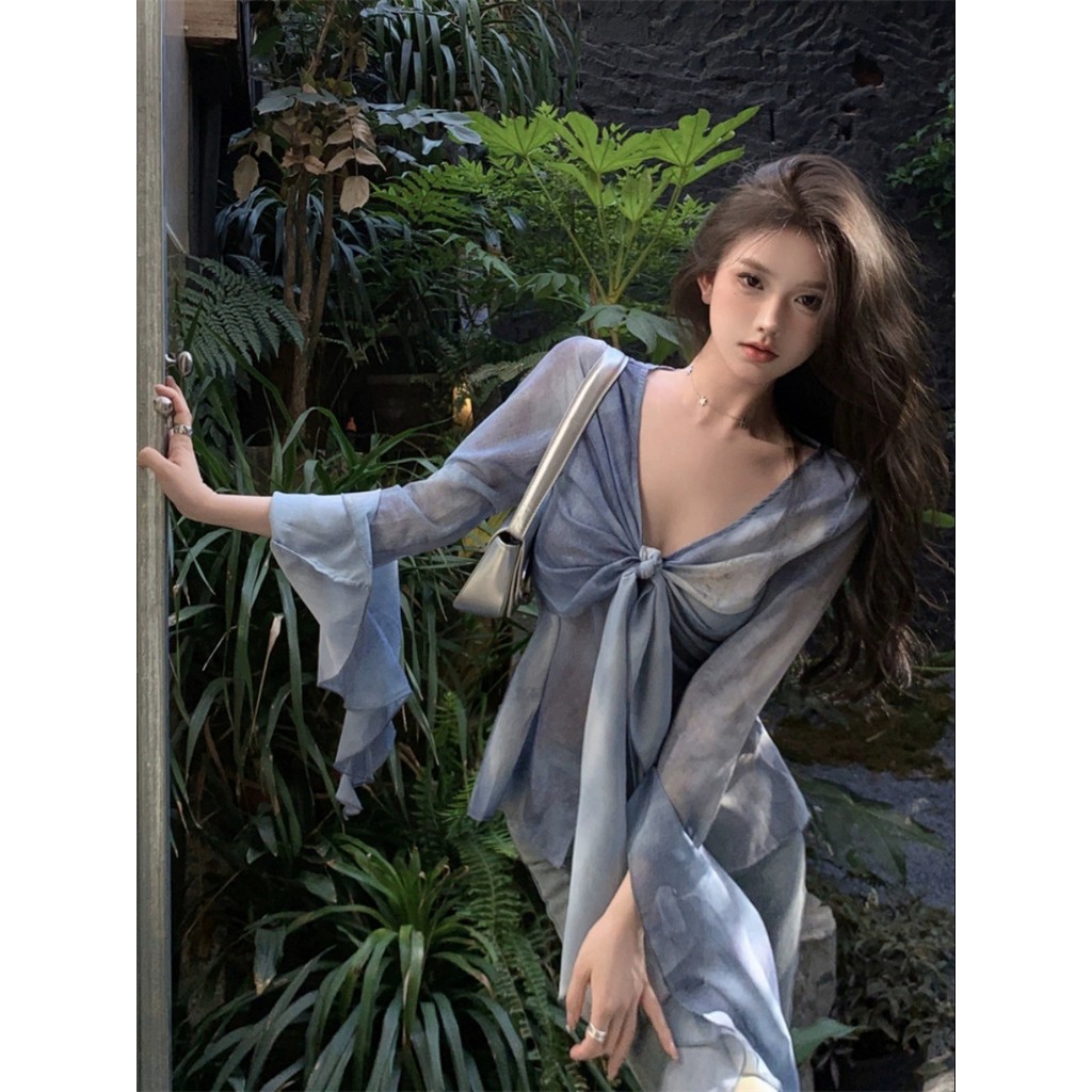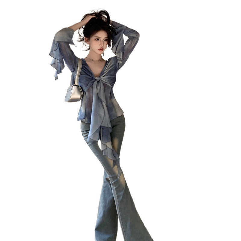 ?Linyufeng? Blue Tie-Dye Ruffle Blouse Women V Neck Korean Style Flare Long Sleeve Loose Casual Fashion Classy Elegant Fitted Ironless Ladies Shirt Top Baju ootd Kemeja Lengan Panjang Perempuan Wanita Terkini Murah Cantik