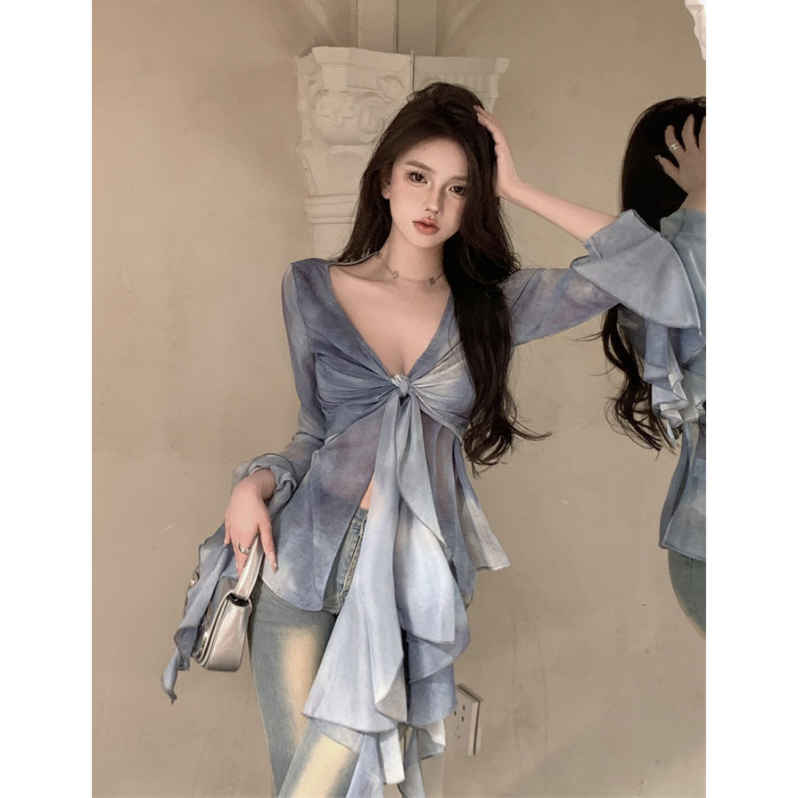 ?Linyufeng? Blue Tie-Dye Ruffle Blouse Women V Neck Korean Style Flare Long Sleeve Loose Casual Fashion Classy Elegant Fitted Ironless Ladies Shirt Top Baju ootd Kemeja Lengan Panjang Perempuan Wanita