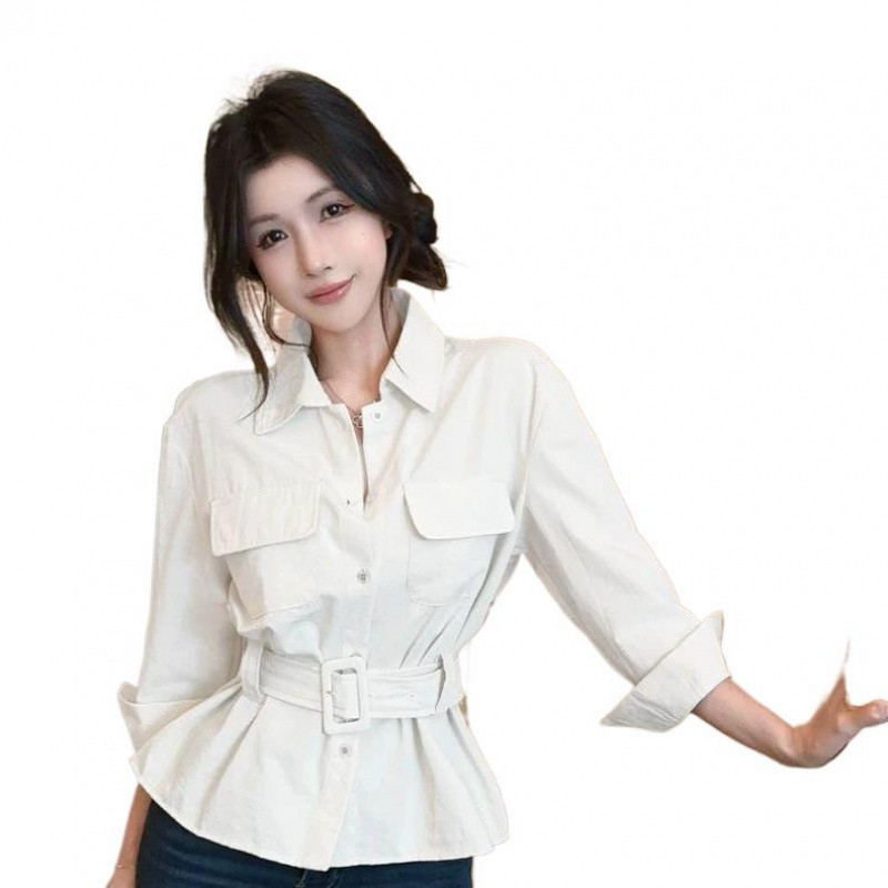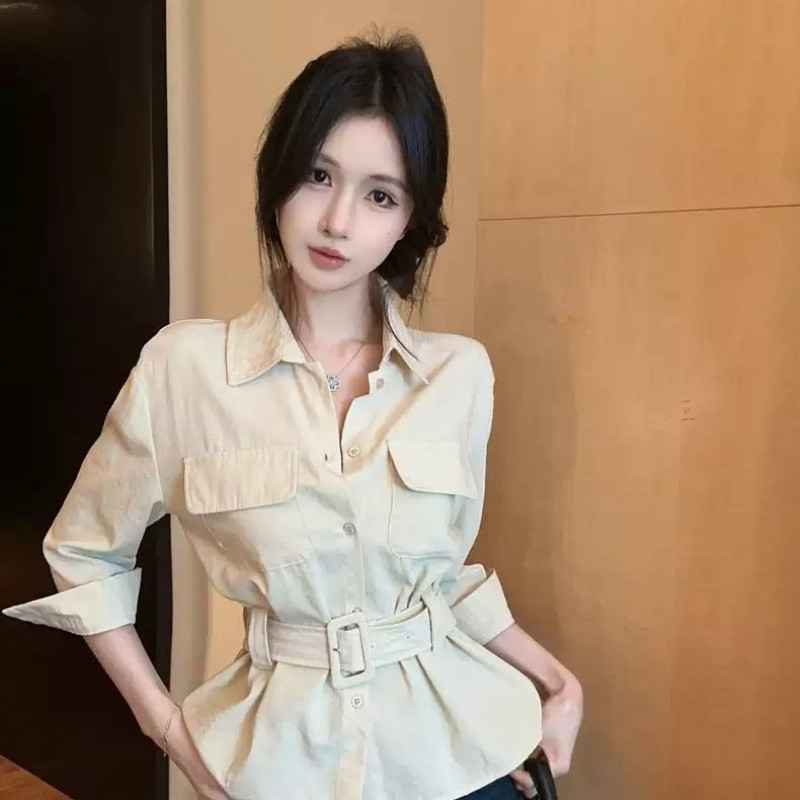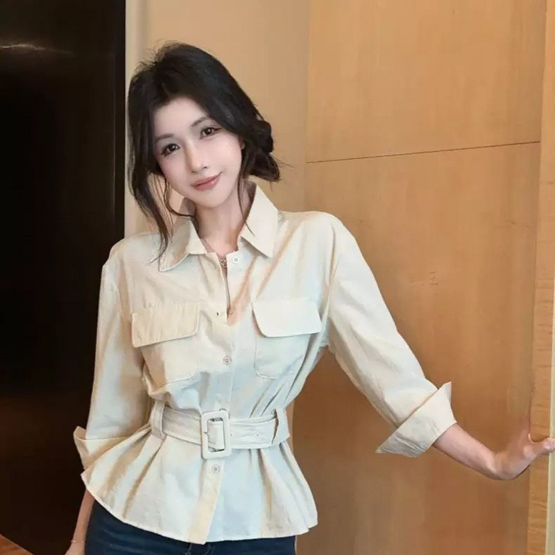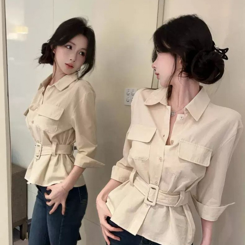 ?Linyufeng? Cargo Style Blouse Women Belted Waist Pocket Office Korean Style Long Sleeve Loose Casual Fashion Classy Elegant Fitted Ironless Ladies Shirt Top Baju ootd Kemeja Lengan Panjang Perempuan Wanita Terkini Murah Cantik