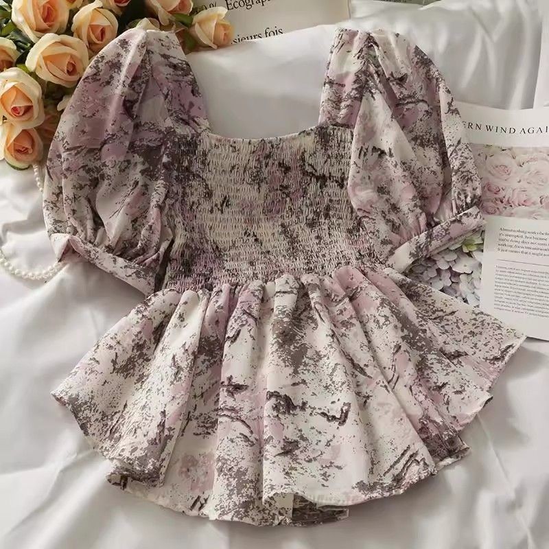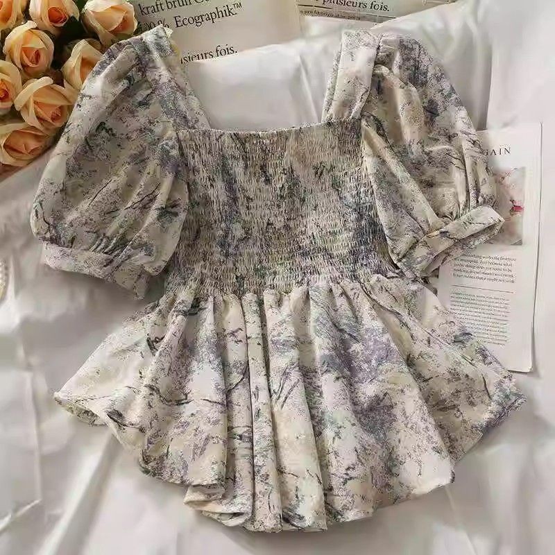 ?Linyufeng? Floral Blouse Women Chiffon Square Neck Ruffled Waist Vintage Korean Style Tie Dye Puff Short Sleeve Loose Classy Elegant Fitted Ironless Ladies Shirt Peplum Top Baju ootd Kemeja Lengan Pendek Perempuan Wanita Terkini Murah Cantik