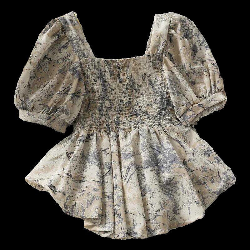 ?Linyufeng? Floral Blouse Women Chiffon Square Neck Ruffled Waist Vintage Korean Style Tie Dye Puff Short Sleeve Loose Classy Elegant Fitted Ironless Ladies Shirt Peplum Top Baju ootd Kemeja Lengan Pe