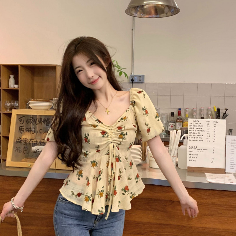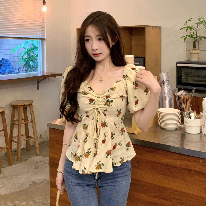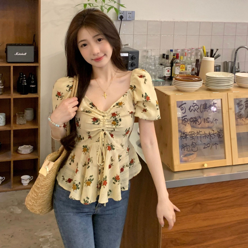 ?Linyufeng? Floral Blouse Women Cute Korean Style Apricot Pleated Drawstring Puff Short Sleeve Loose Casual Fashion Classy Elegant Fitted Ironless Ladies Shirt Top Baju ootd Kemeja Lengan Pendek Perempuan Wanita Terkini Murah Cantik
