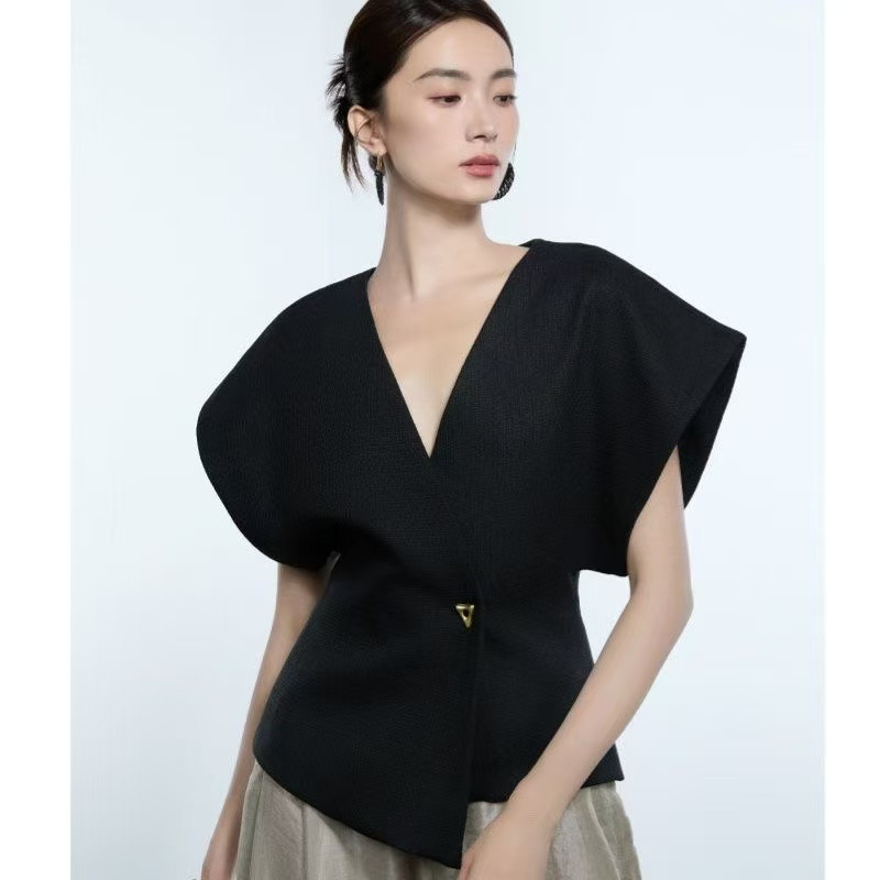 ?Linyufeng? Irregular Blouse Women Slim Waist Korean Style V Neck Short Sleeve Loose Classy Elegant Ironless Casual Ladies Shirt Top Black Baju ootd Kemeja Tanpa Lengan Perempuan Wanita Terkini Murah Cantik
