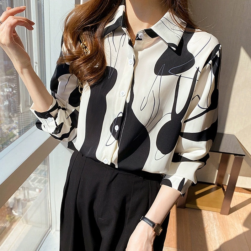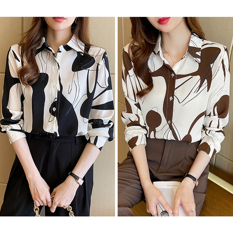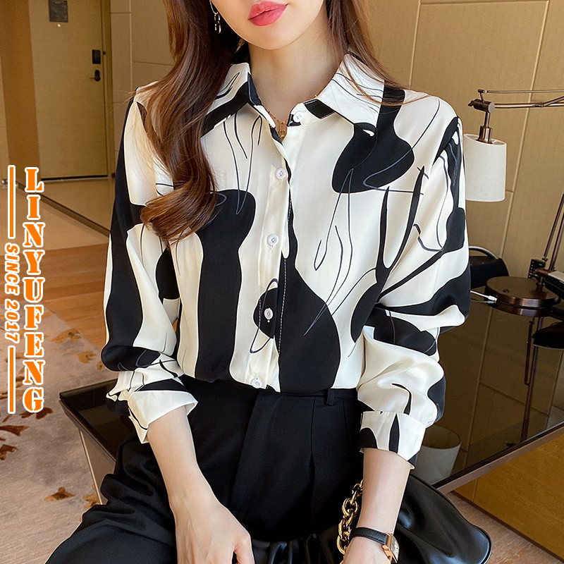 ?Linyufeng? Plus Size M-4XL Geometric Patterns Printed Chiffon Blouse Women Ironless Baggy Flowy Korean Style Long Sleeve LooseVintage Ladies Shirt Woman Elegant Temperament Top Baju ootd Kemeja Lengan Panjang Perempuan Wanita Terkini Murah Cantik