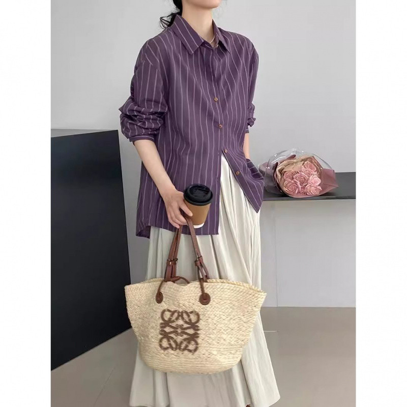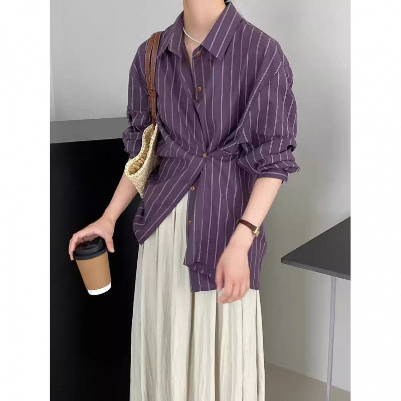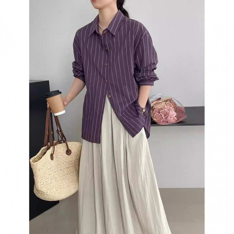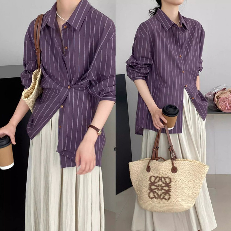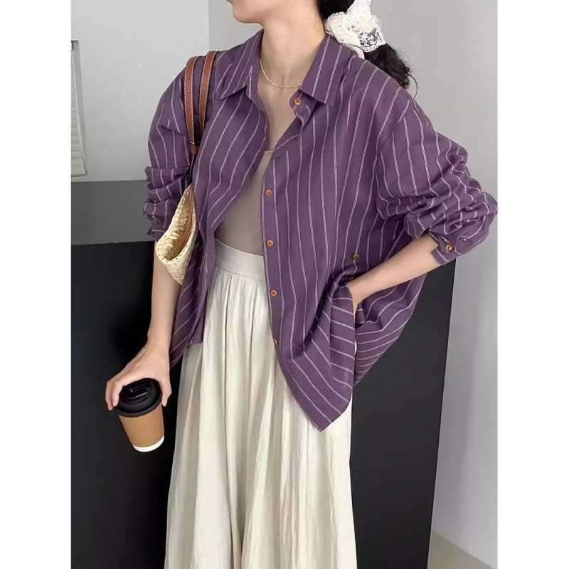 ?Linyufeng? Purple Stripe Blouse Women Korean Style Long Sleeve Loose Classy Elegant Ironless Casual Ladies Shirt Top Baju ootd Kemeja Lengan Panjang Perempuan Wanita Terkini Murah Cantik