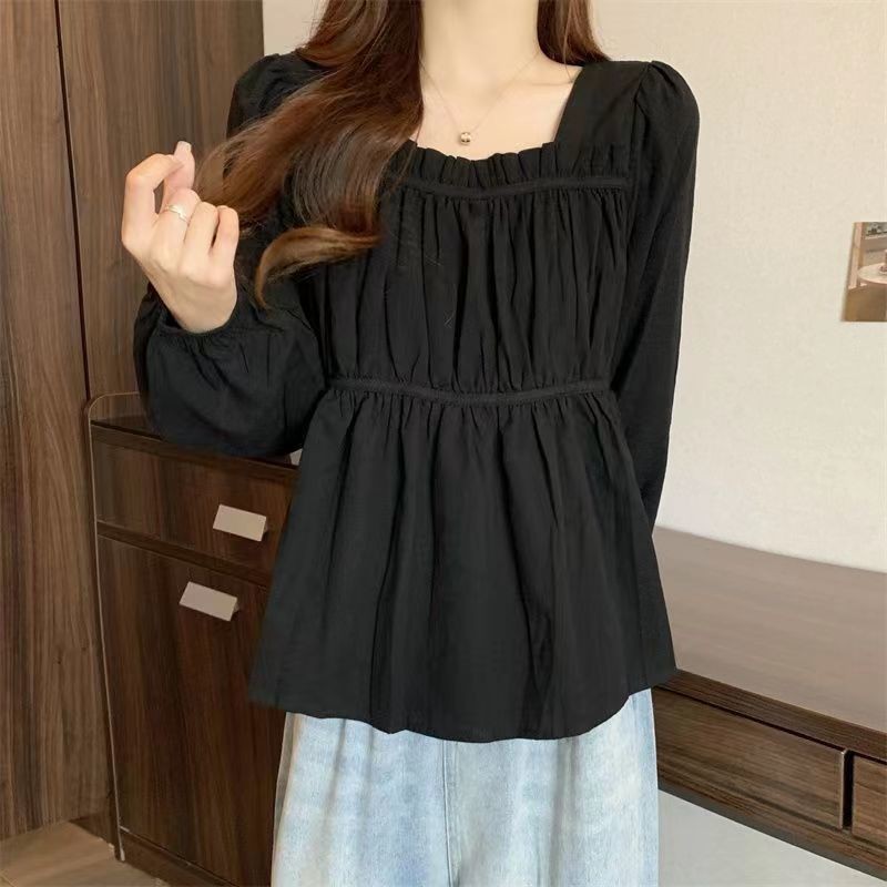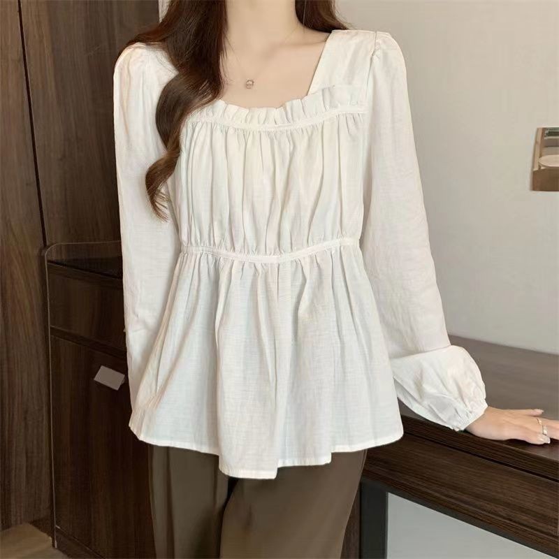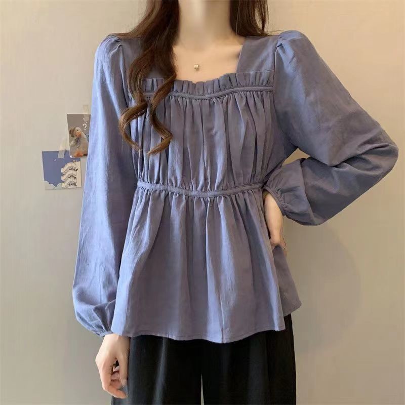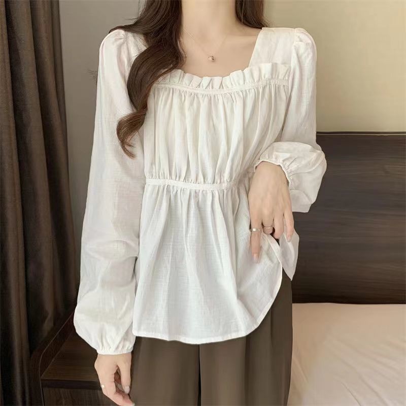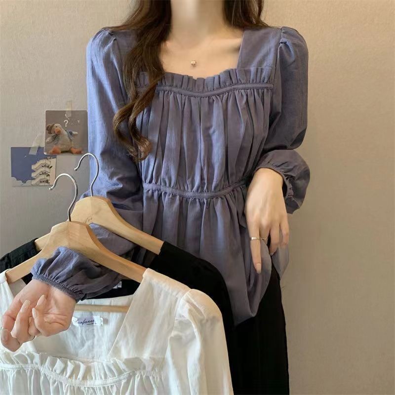 ?Linyufeng? Ruffle Blouse Women Square Neck Korean Style Puff Long Sleeve Pleated Waist Loose Classy Elegant Ironless Fitted Casual Ladies Shirt Peplum Top Baju ootd Kemeja Lengan Pendek Perempuan Wanita Terkini Murah Cantik