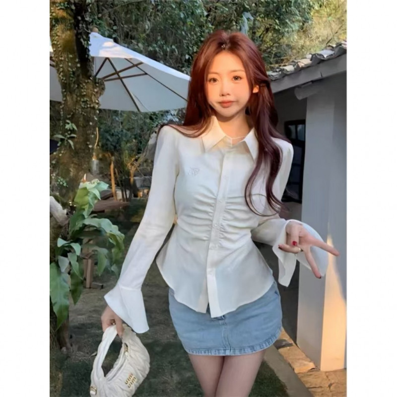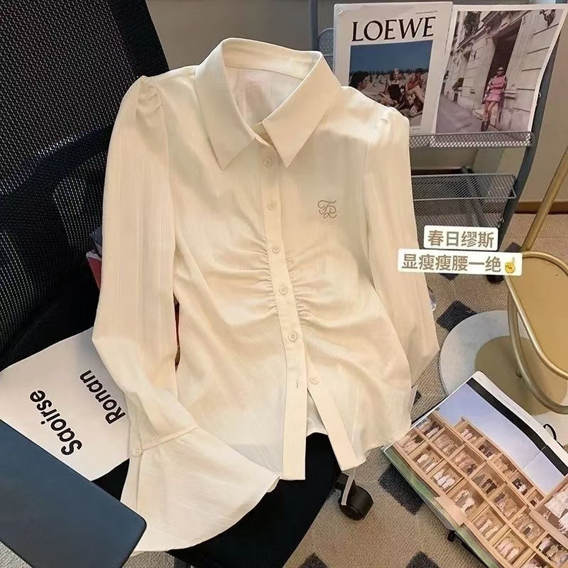 ?Linyufeng? Tunic Blouse Women Office Outfit Korean Style Student White Blue Classy Fitted Elegant ironless Ladies Slim Waist Pleated Long Bell Sleeve Shirt Top Baju Kemeja Putih Biru Lengan Panjang Perempuan Wanita Terkini Murah Cantik