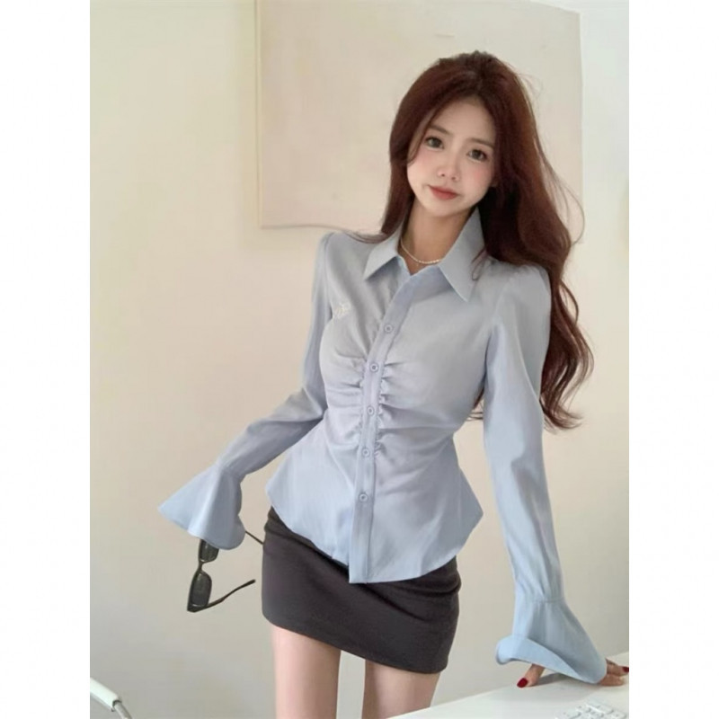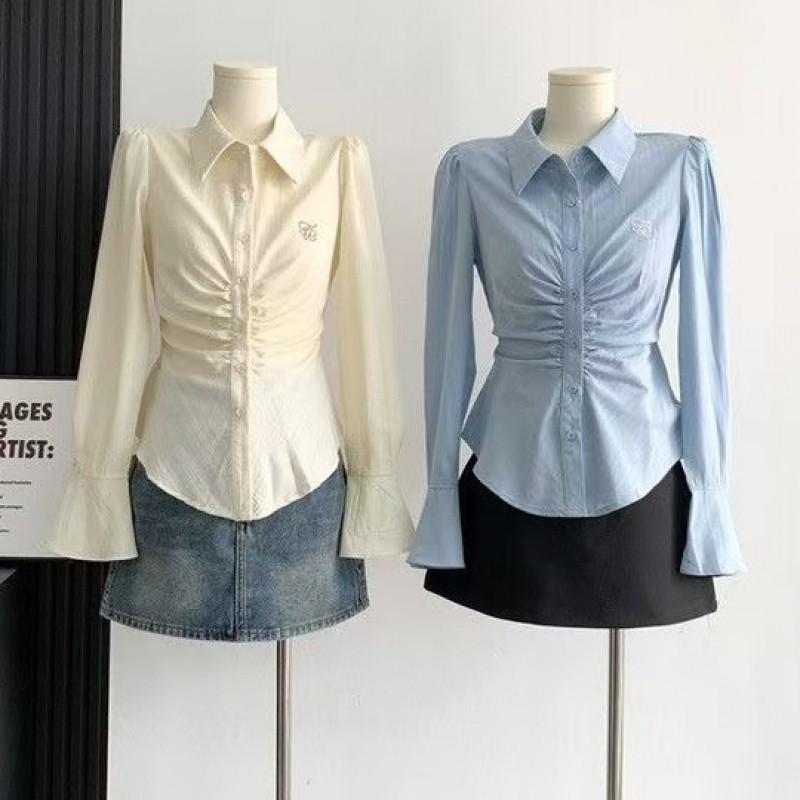 ?Linyufeng? Tunic Blouse Women Office Outfit Korean Style White Classy Fitted Elegant ironless Ladies Slim Waist Pleated Long Bell Sleeve Shirt Top Baju Kemeja Putih Biru Lengan Panjang Perempuan Wani