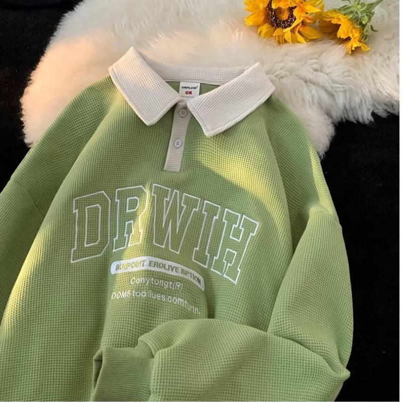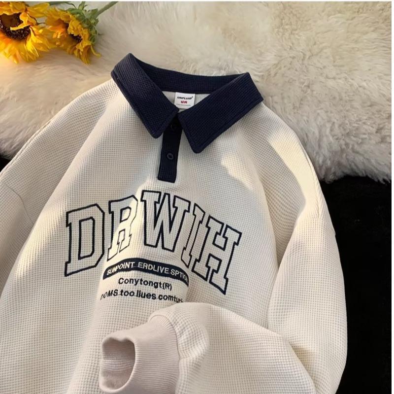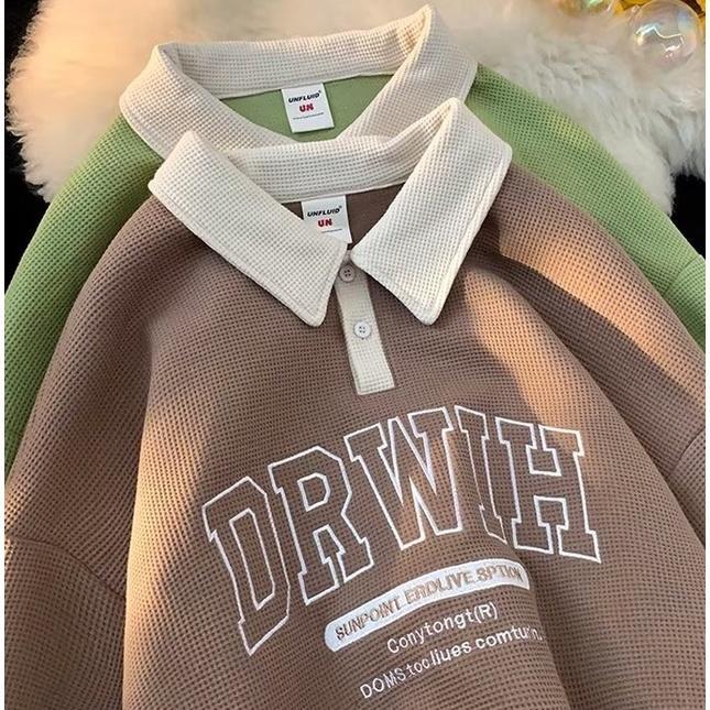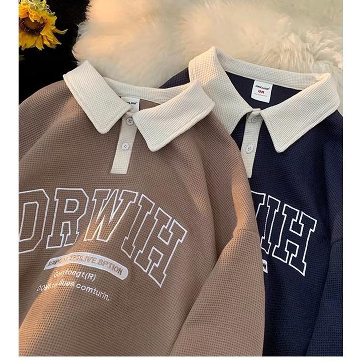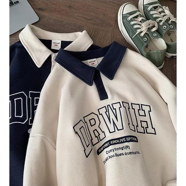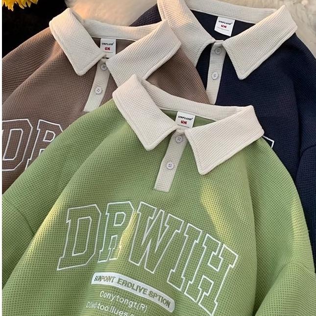 【Local Delivery】Korean Style Oversized Sweatshirt Waffle Design Men Baju POLO lelaki Letter Lapel Loose Polo Shirt Preppy Style Fashion Casual Shirt Ready Stock