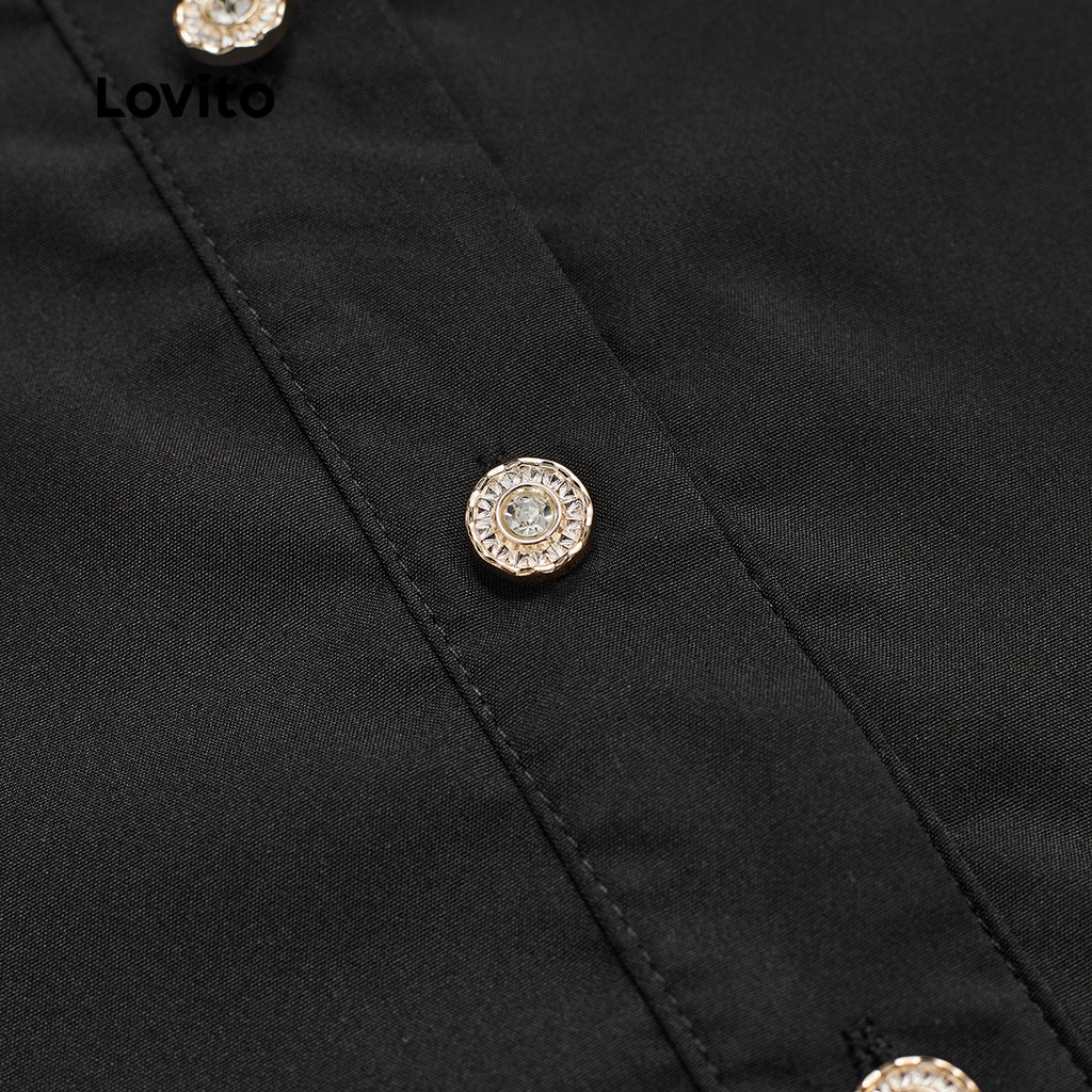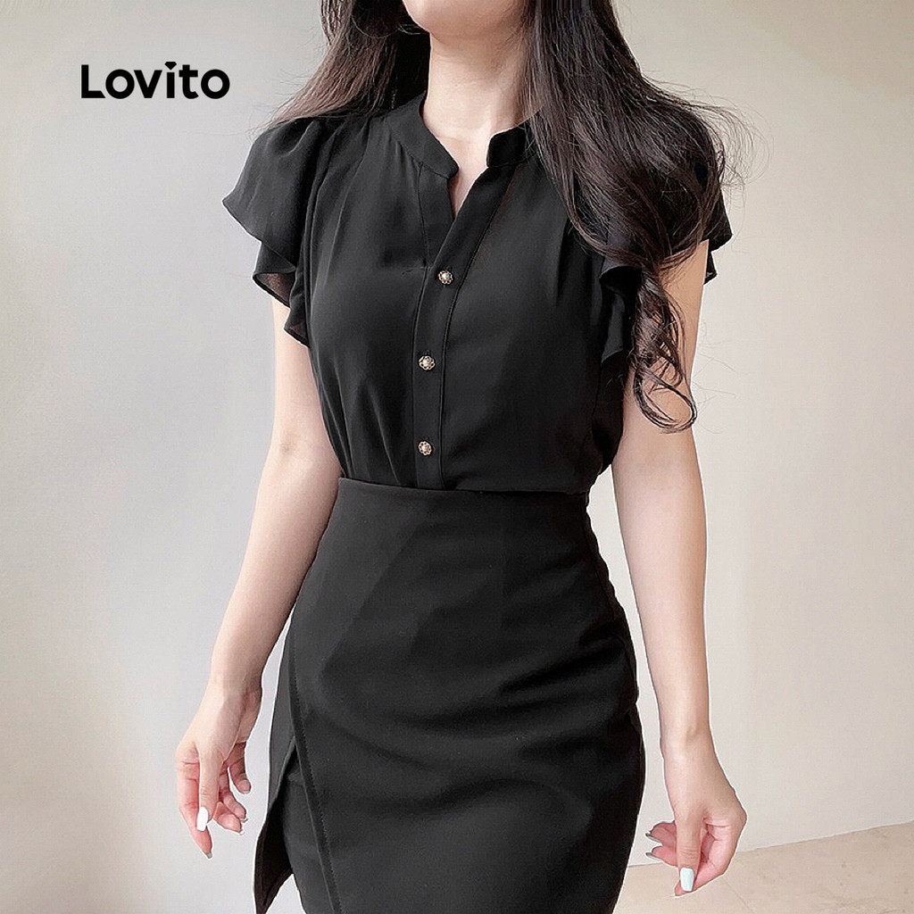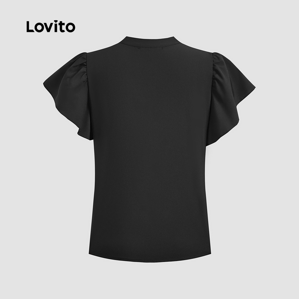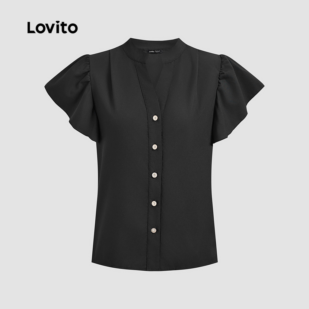 Lovito Blaus Kasual Wanita Ruffle Polos Butang Musim Panas L129AD1030
