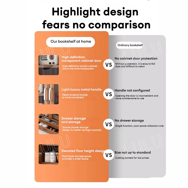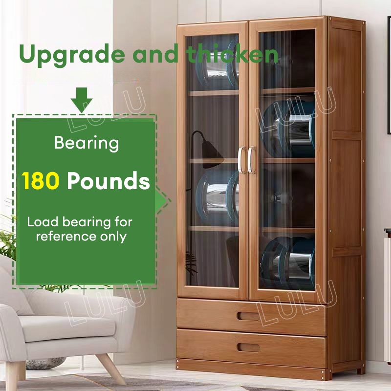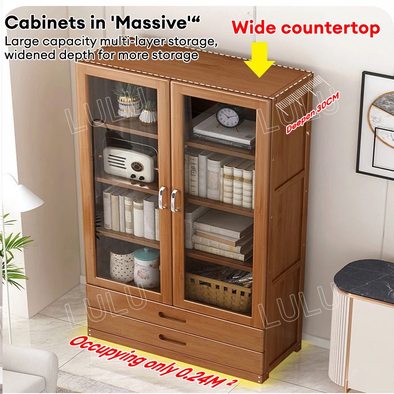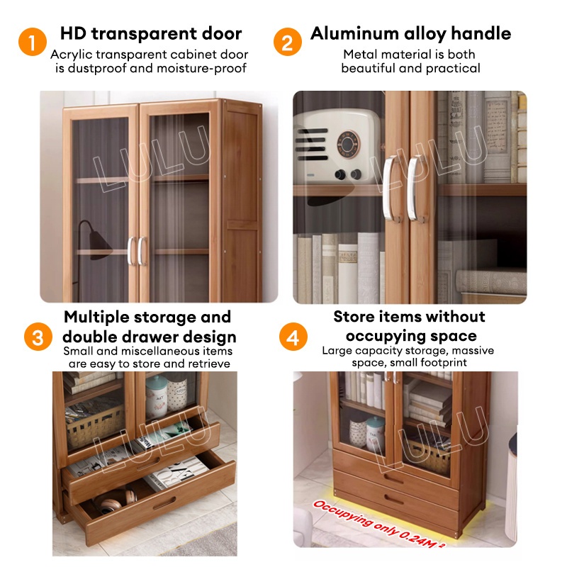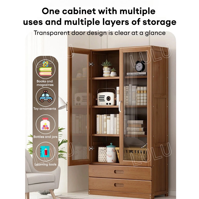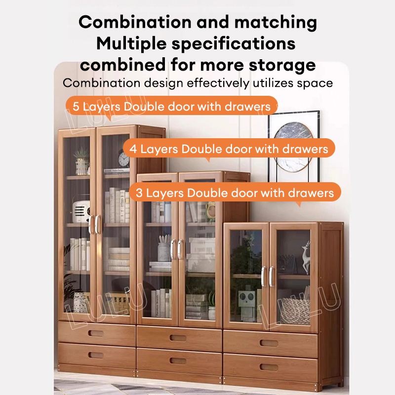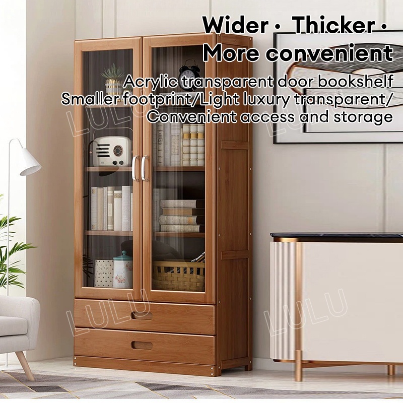 LULU Bamboo Book Shelf Rak Buku Bertutup With 2Drawer Storage Cabinet Rack Almari Buku Bertutup 置物架