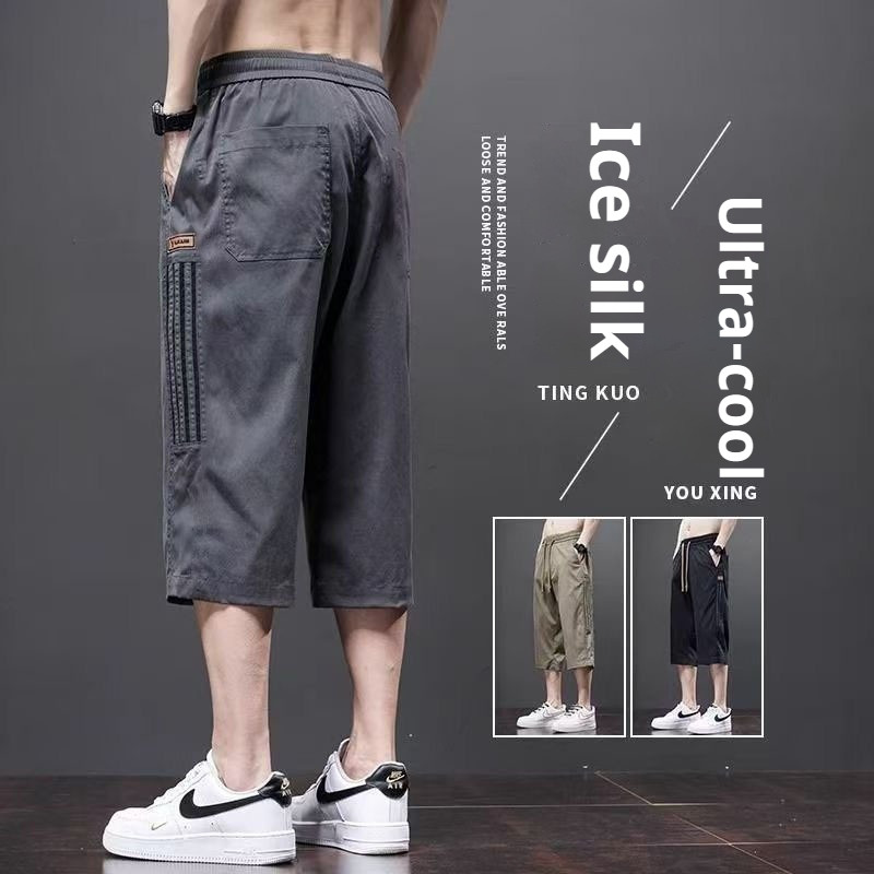 M-5XL Men's Summer Ice Silk Breathable Cool Knee Length Striped Short Pants Loose Over Knee Shorts Sports Quick Dry Cropped 3/4 Jogger Pants Plus Size Black Grey