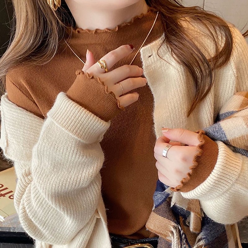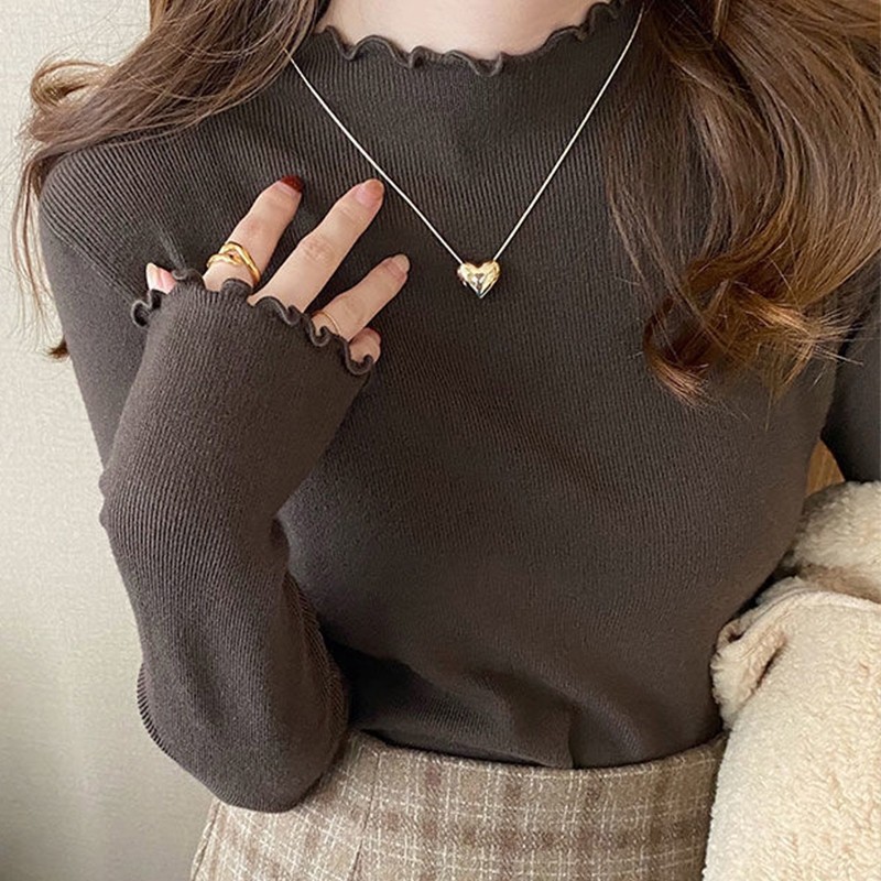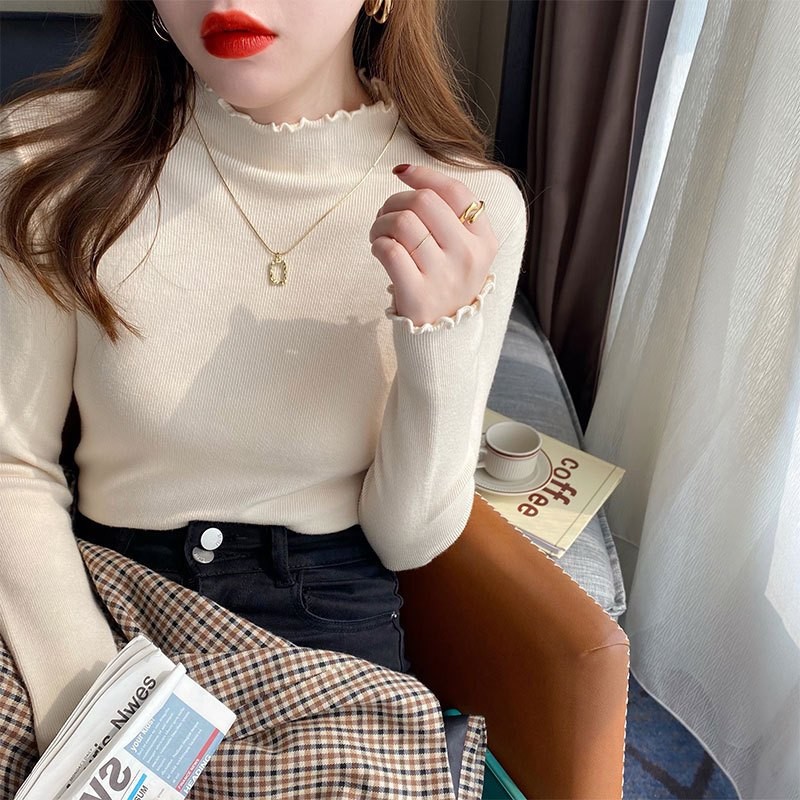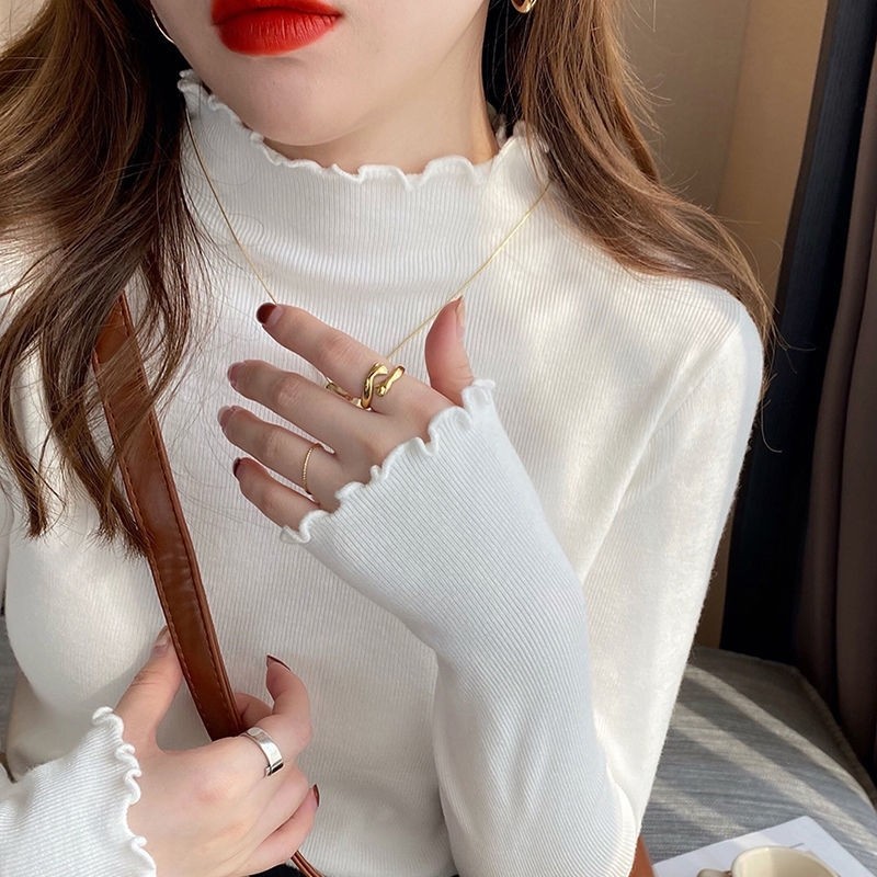 【Malaysia stock】Bottoming Shirt Women's Autumn Winter Ruffle Edge Half Turtleneck Sweater Knitted Top Amika1