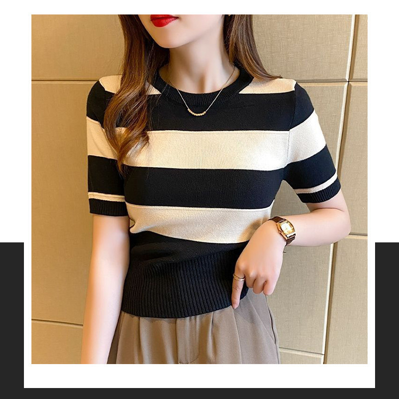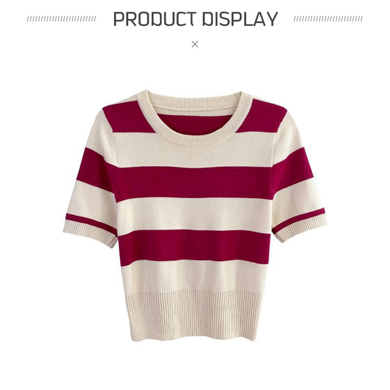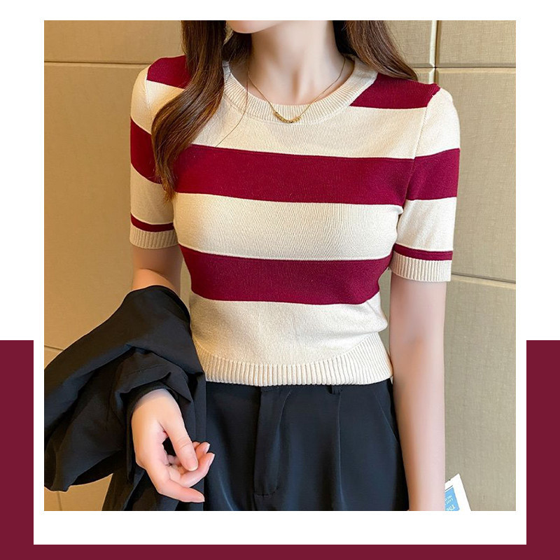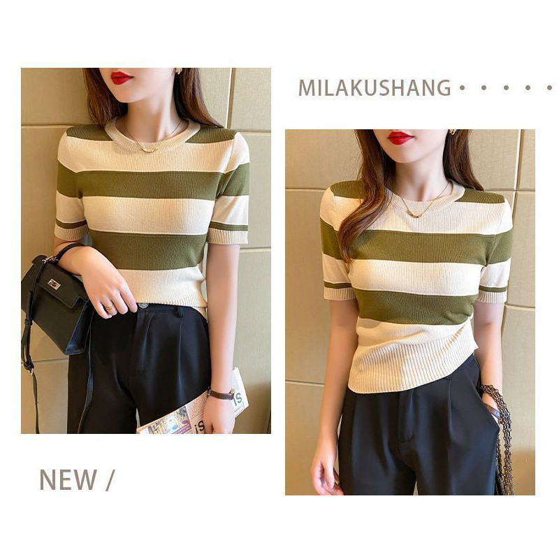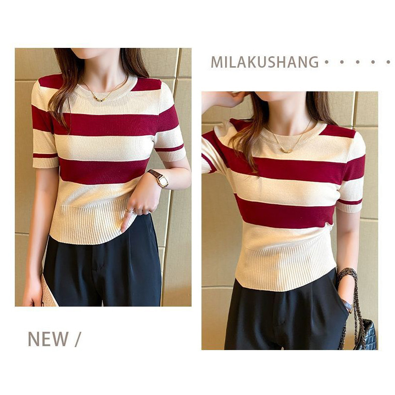 【Malaysia stock】Korean Version Thin Striped Short Sleeve Women Slim Fitting Knitwear Short Top SL