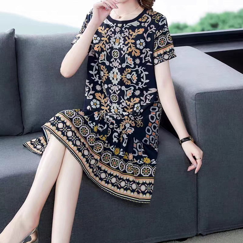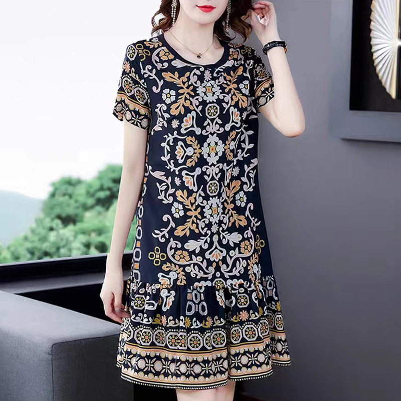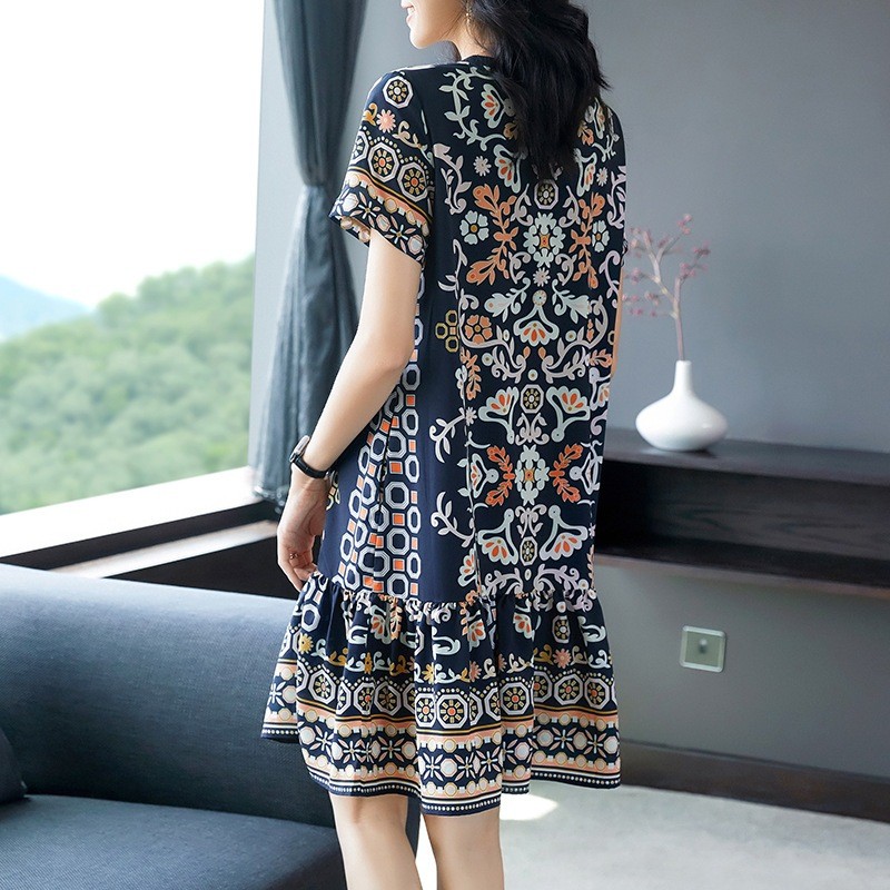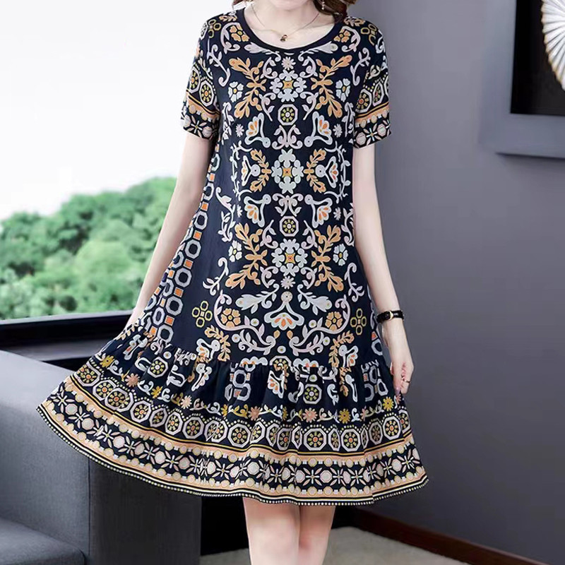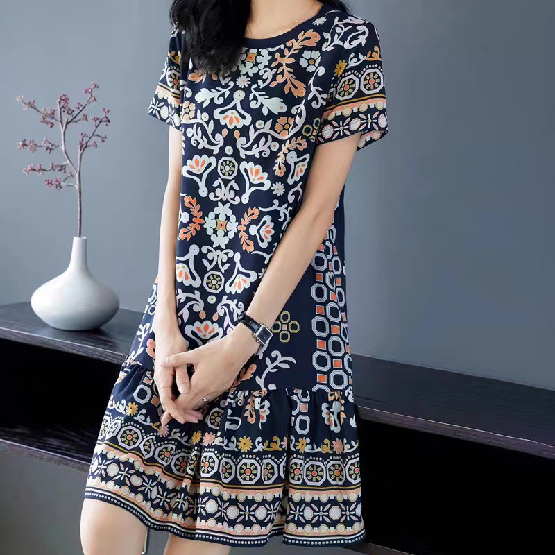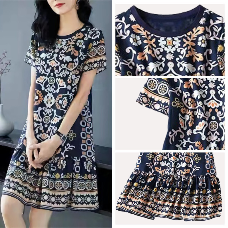 【Malaysia stock】Retro Printed Round Neck Mid-length Dress Loose Casual Short Sleeved Dress Slimming Dress Amika1
