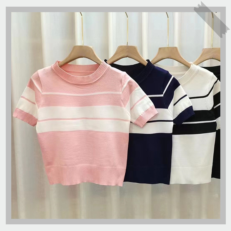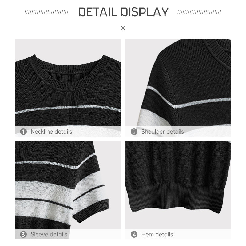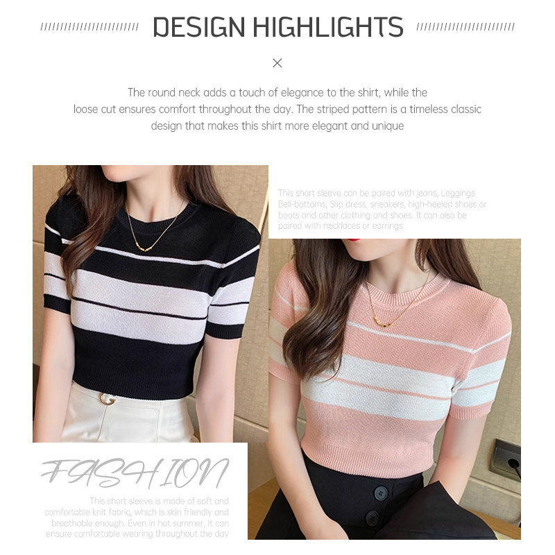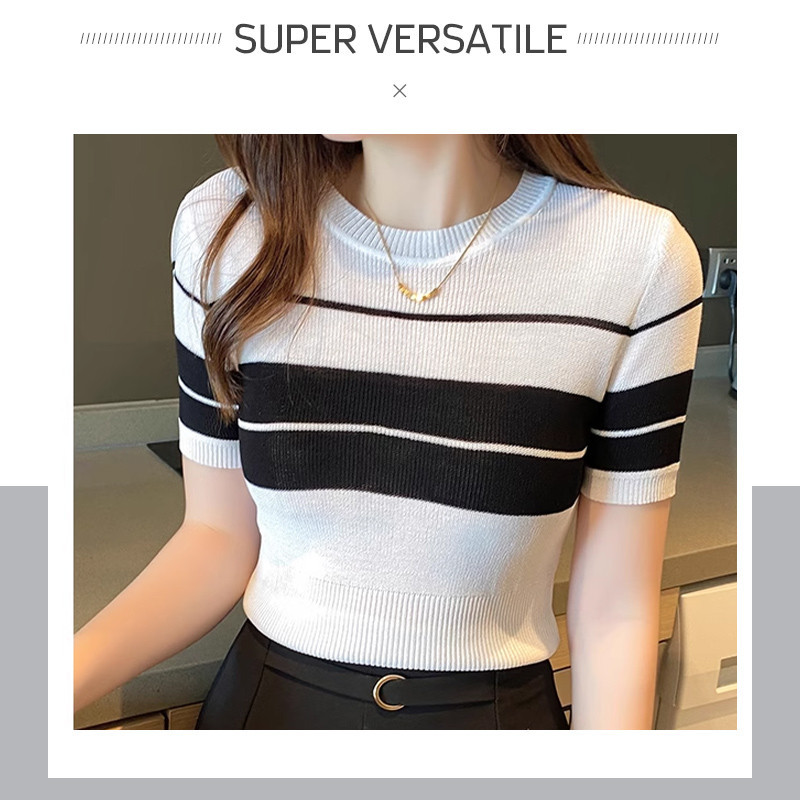 【Malaysia stock】Summer Versatile Top Thin Black White Contrast Color Stripe Short Sleeved Knitwear Women SL