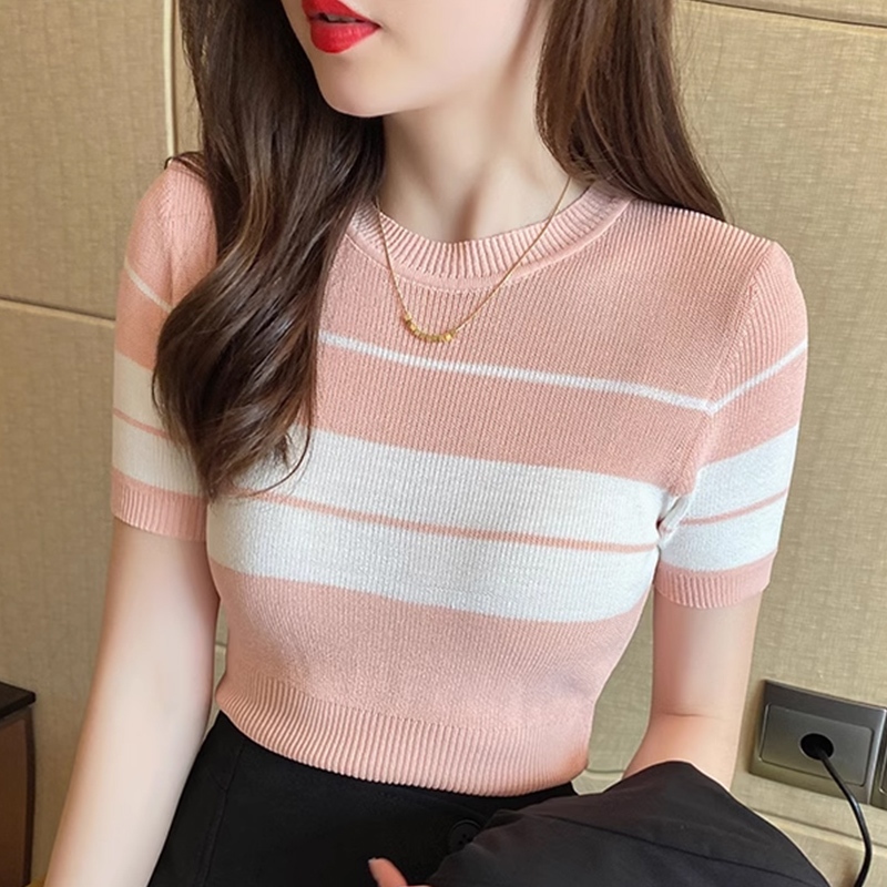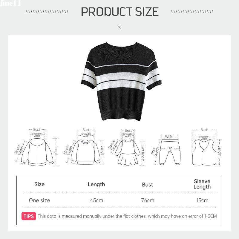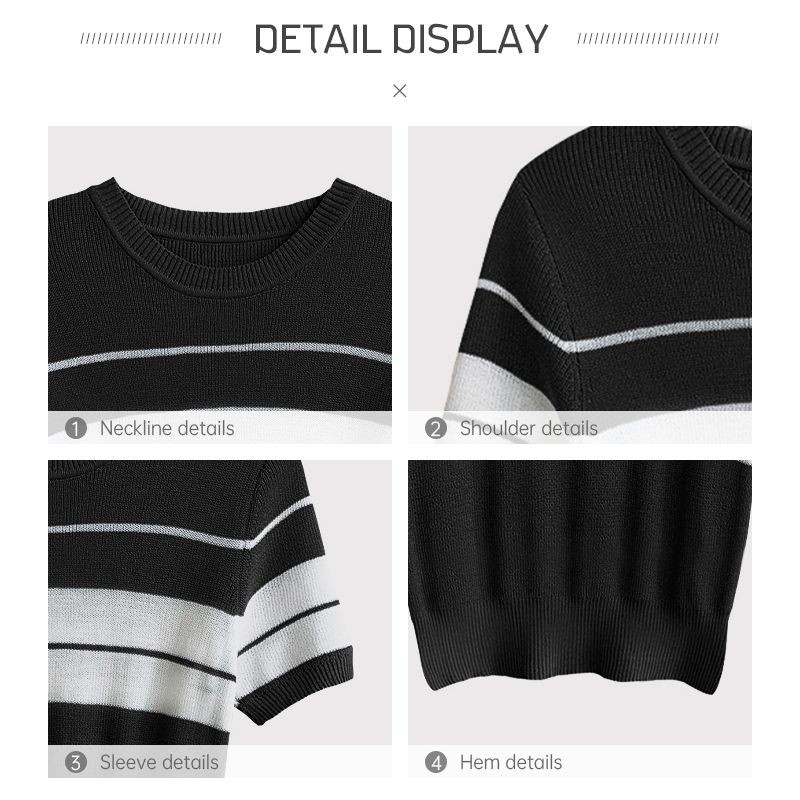 【Malaysia stock】 Women Short Sleeved Knitwear Thin Black White Contrast Color Stripe Summer Versatile Top fine11
