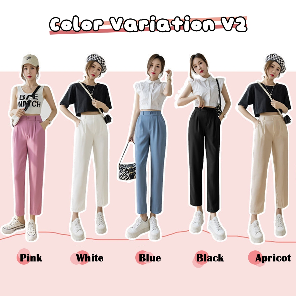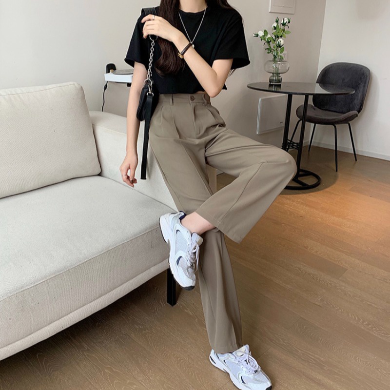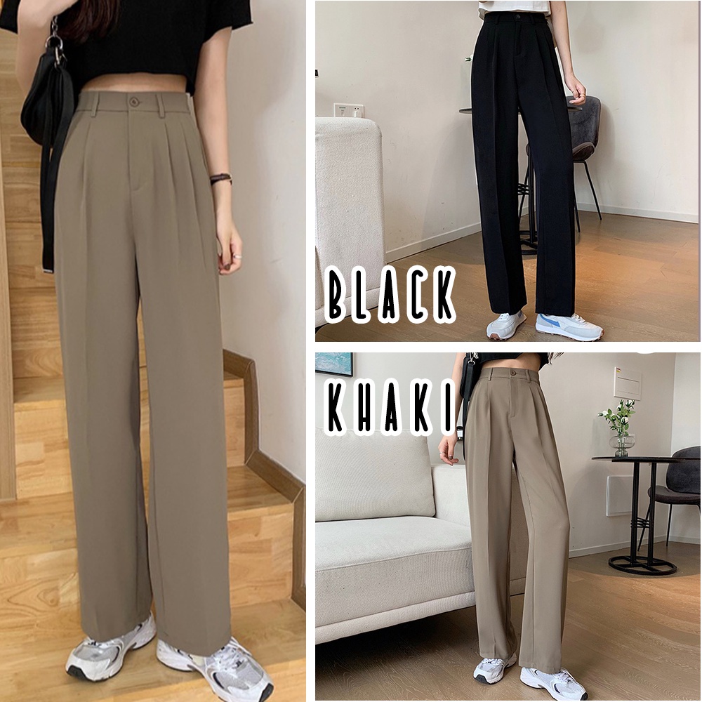 MAYA Korean Style Women Straight Leg Long Pants Suit Pants High Waist Elastic Waist