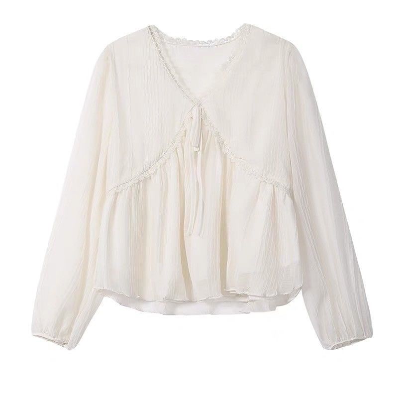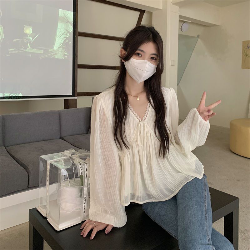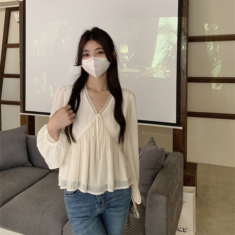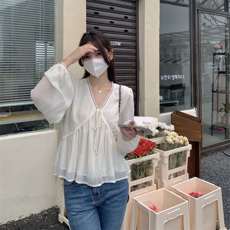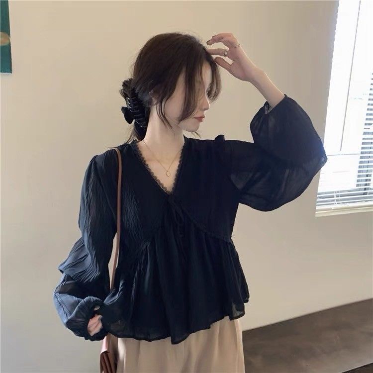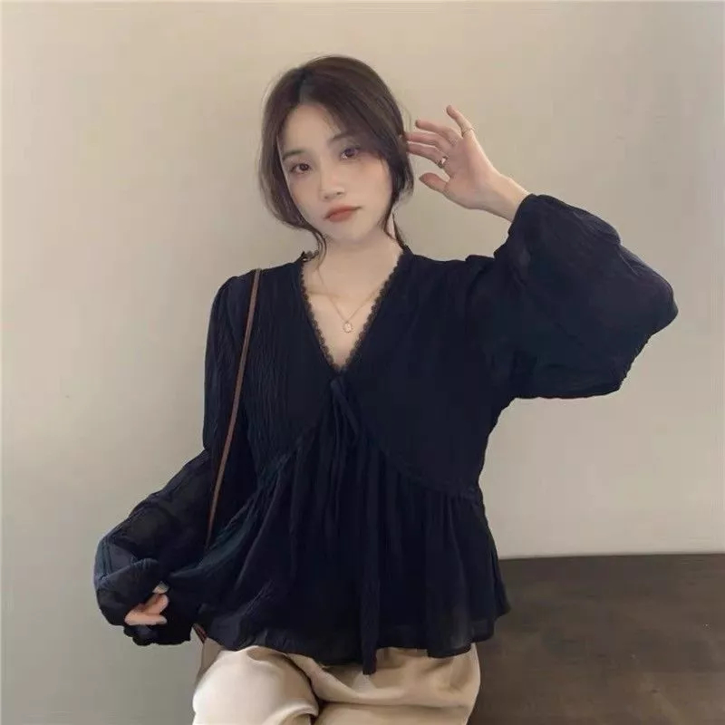 ?MiHo?Blouse Women Korean Style Ladies Loose Solid Color V Neck Long Sleeve Shirt Plus Size Baju Kemeja Perempuan Classy Outfit
