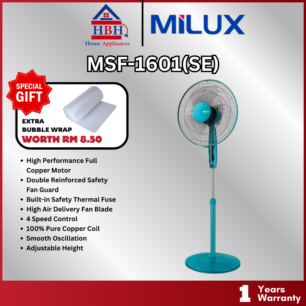 Milux Stand Fan MGF-10 | MSF-1601SE | 3 Speeds | 10 Inch | 16 Inch | 5 Meter Long Reach Air Delivery