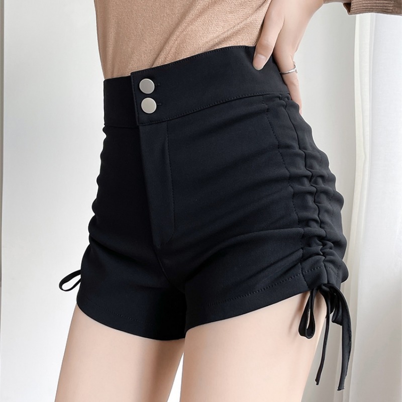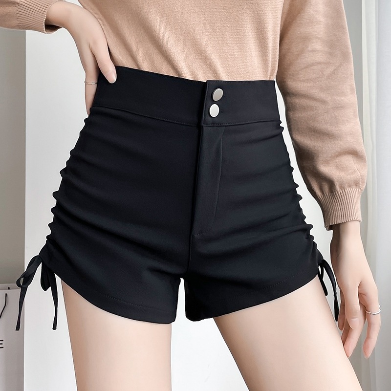 MOCHA Women Black Short Pants High Waist Shorts Elastic Slim Drawstring Pleated Shorts 短褲女 ST140