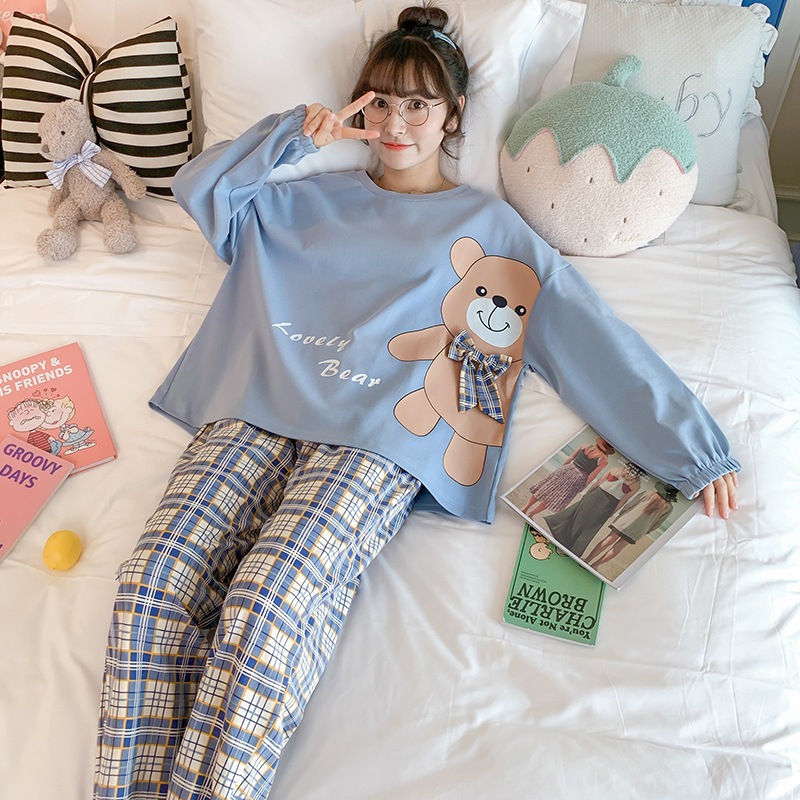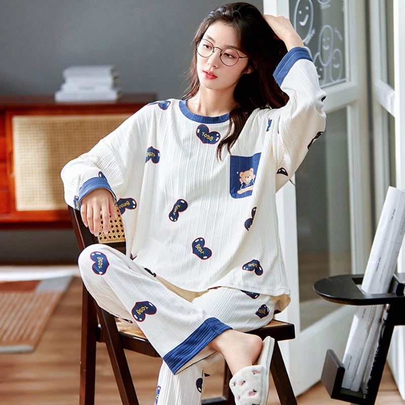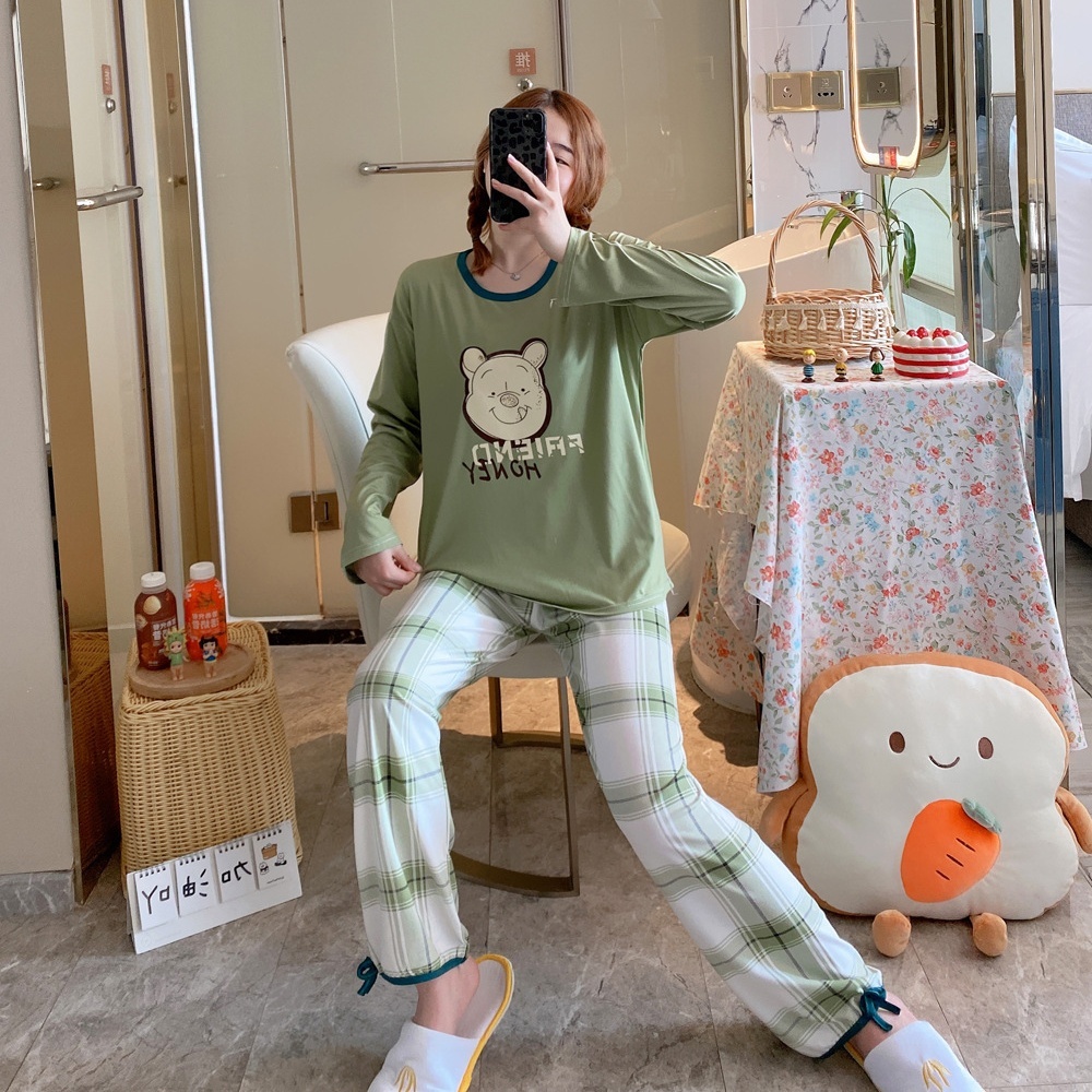 MOCHA Women Pajamas Long Sleeve Sleepwear Plus-size Cartoon Print Nightwear Baju Tidur Panjang ST102