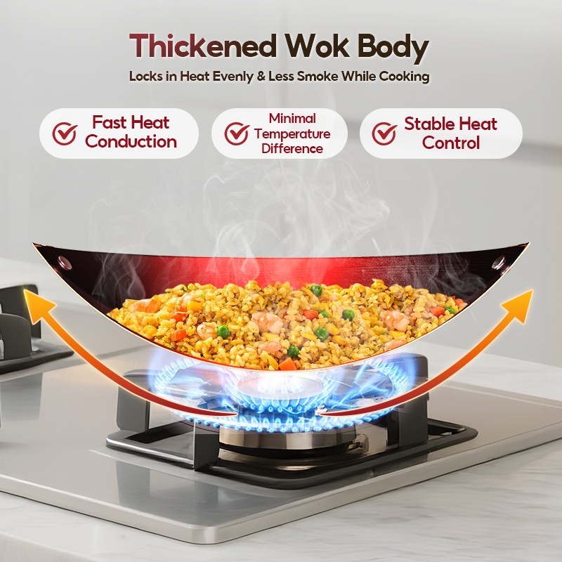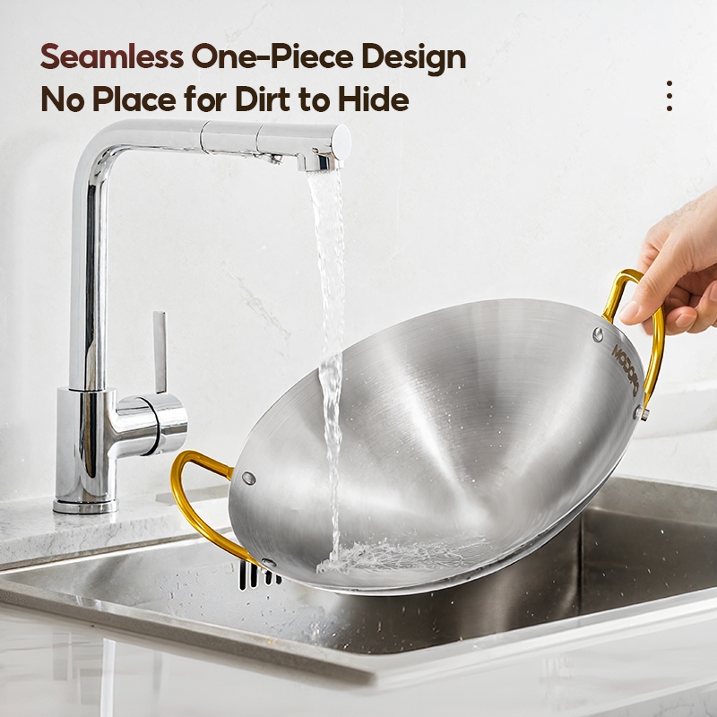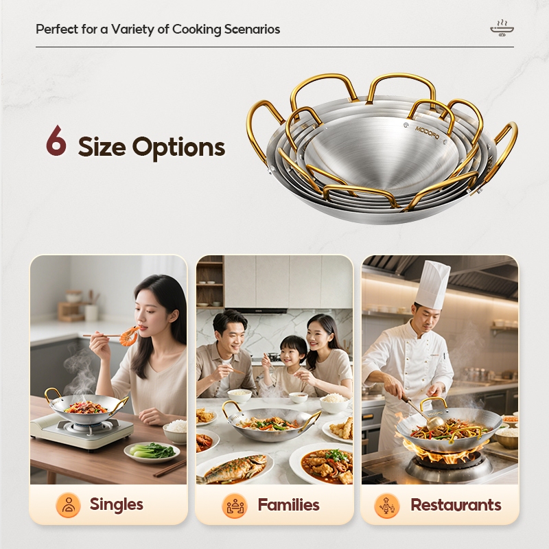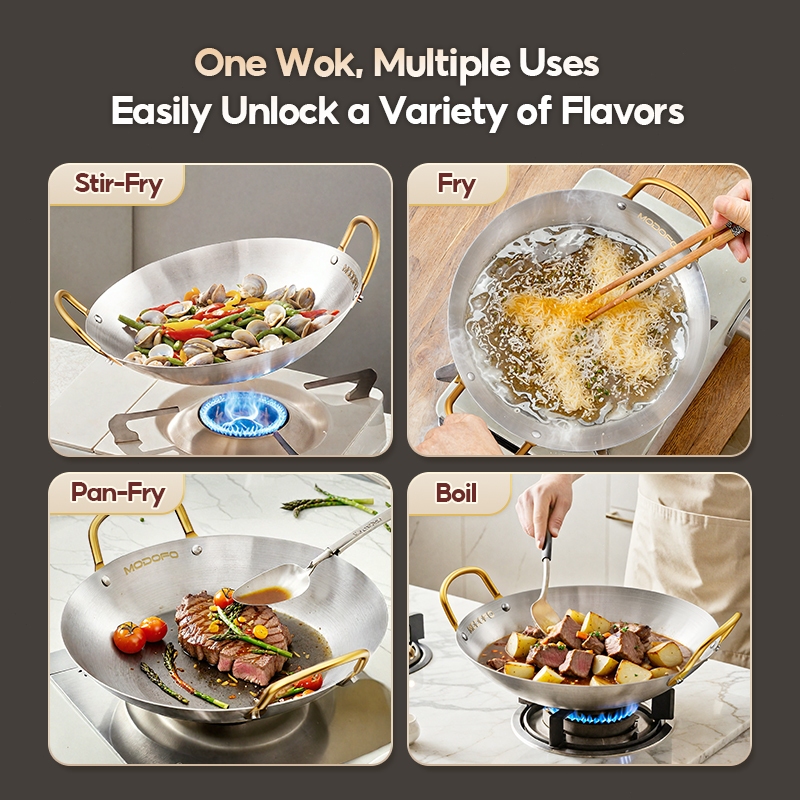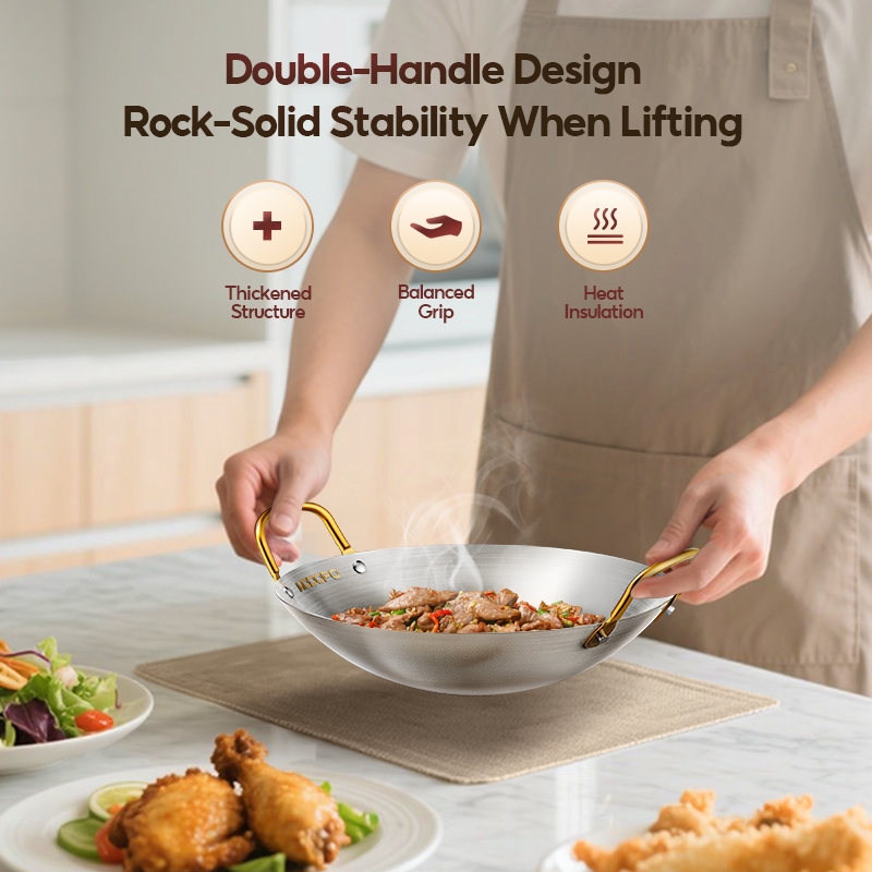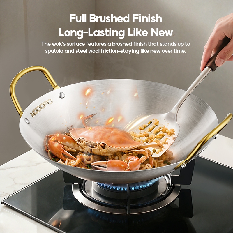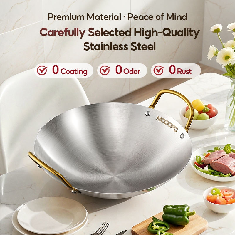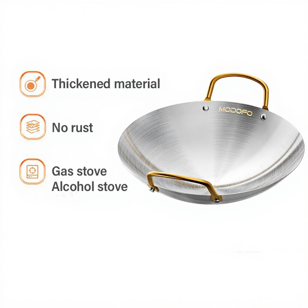 MODOFO Kuali Stainless Steel Pemegang Emas untuk Dapur Gas | Wok Besi Tahan Karat | Kuali Besar dengan Tudung