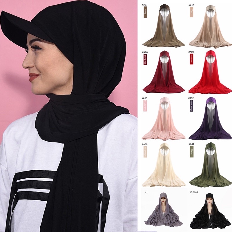 Muslim Fashion Hijab New Baseball Head Cap Hijab Solid Chiffon Shawl Tudung Sukan Chiffon Instant Scarf