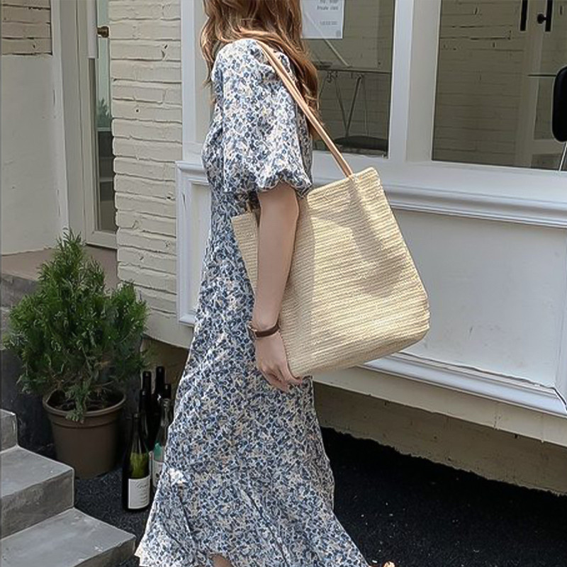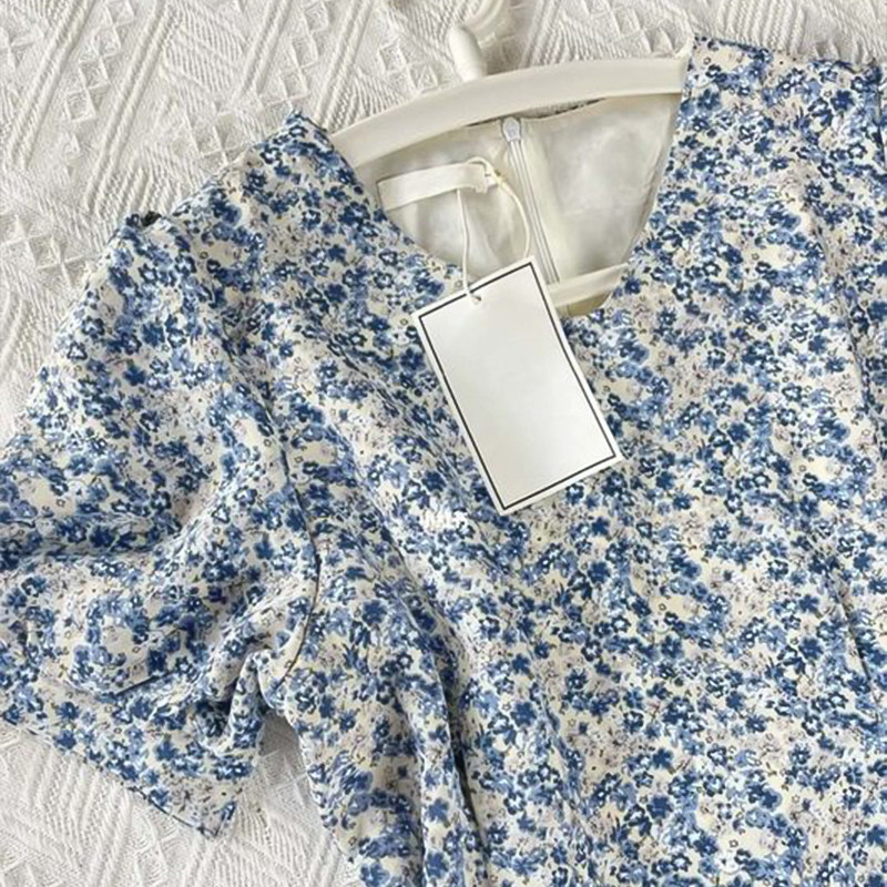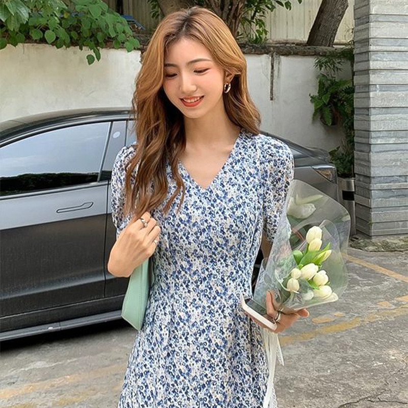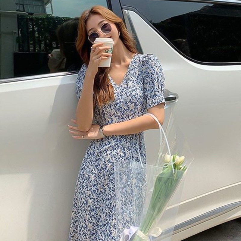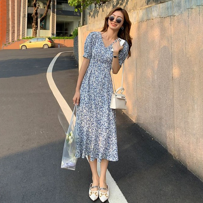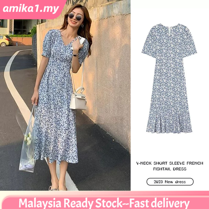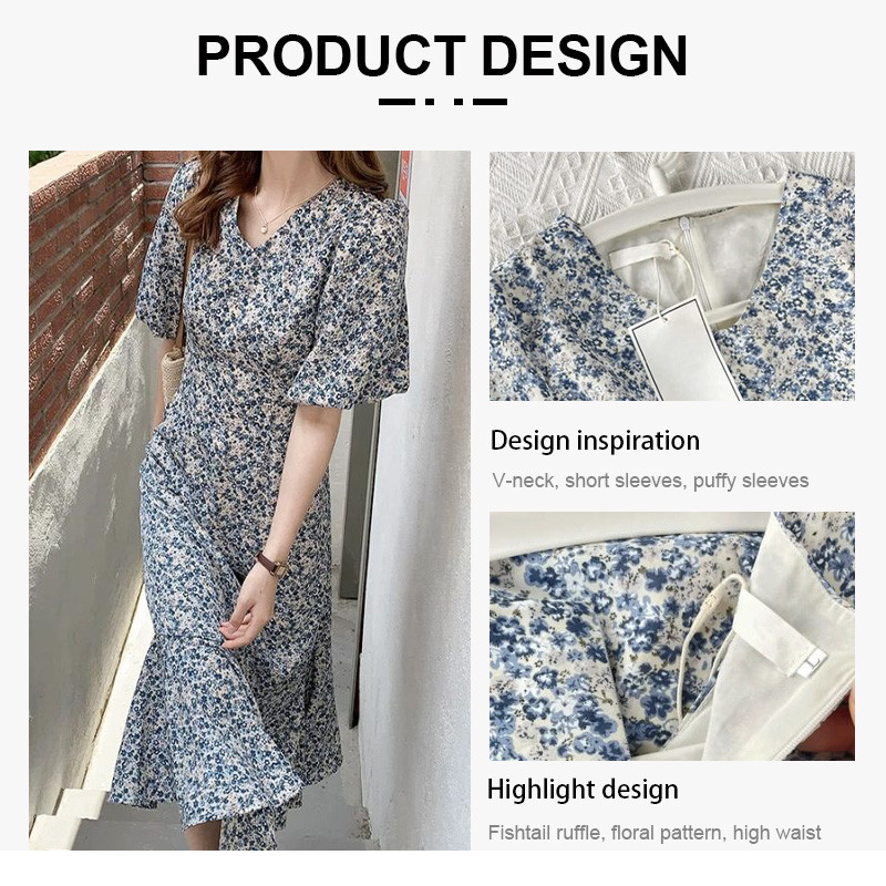 MY STOCK & Amika1 Korean Fashion Long Dress Blue Fishtail Floral Dress Women Elegant French Long-sleeved V-neck Maxi Dress