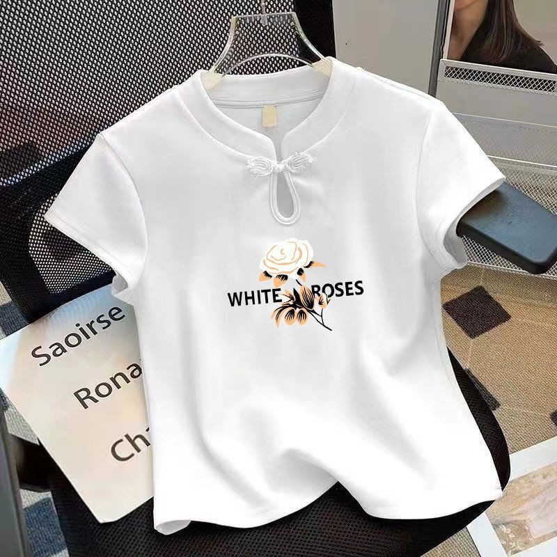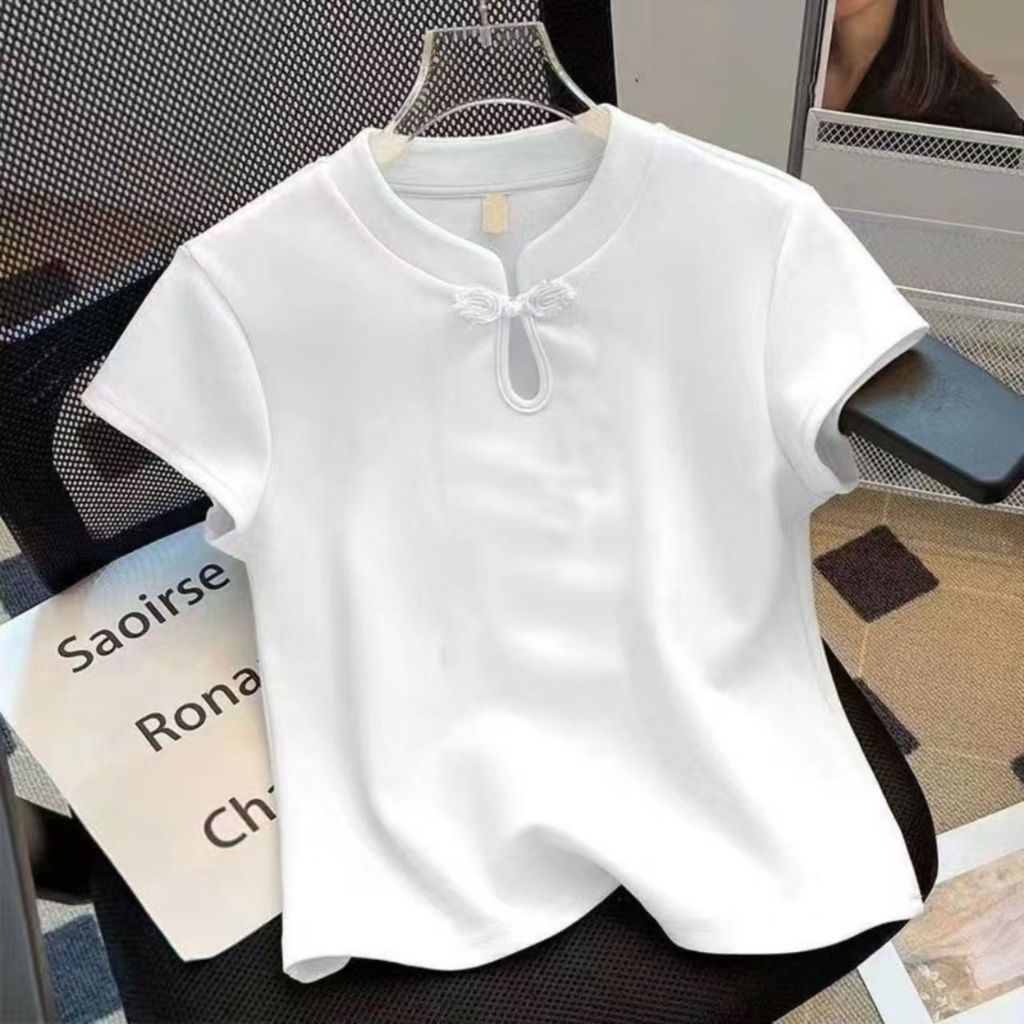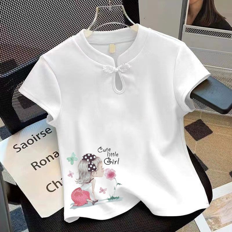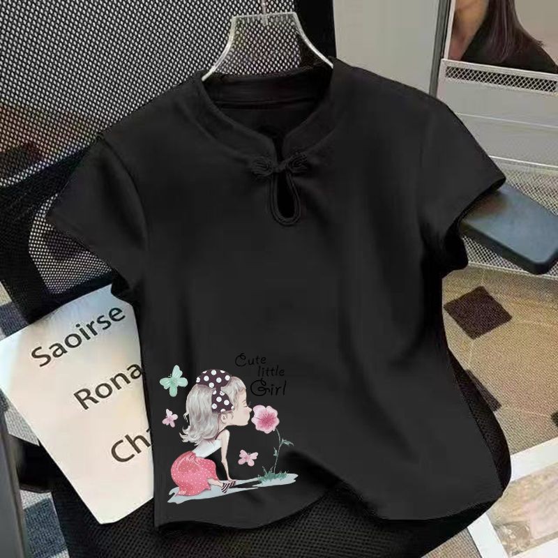 New Chinese style summer hollow short sleeved T-shirt 2025 new buckle T-shirt printed top for women新中式镂空短袖女t恤夏2025新款盘扣T恤印花上衣女