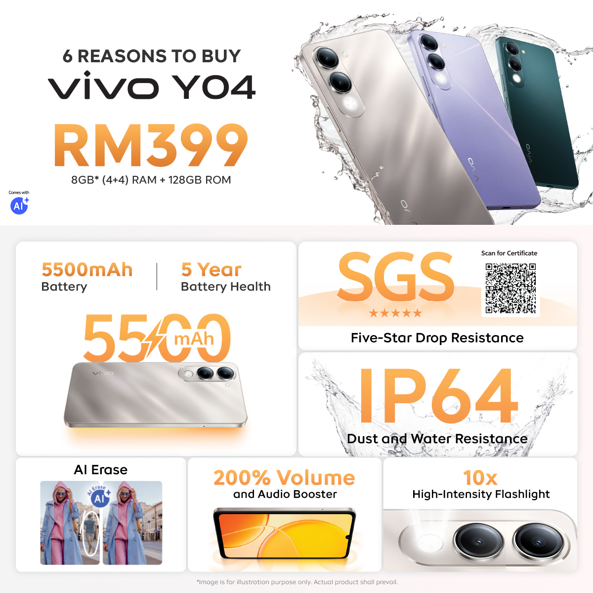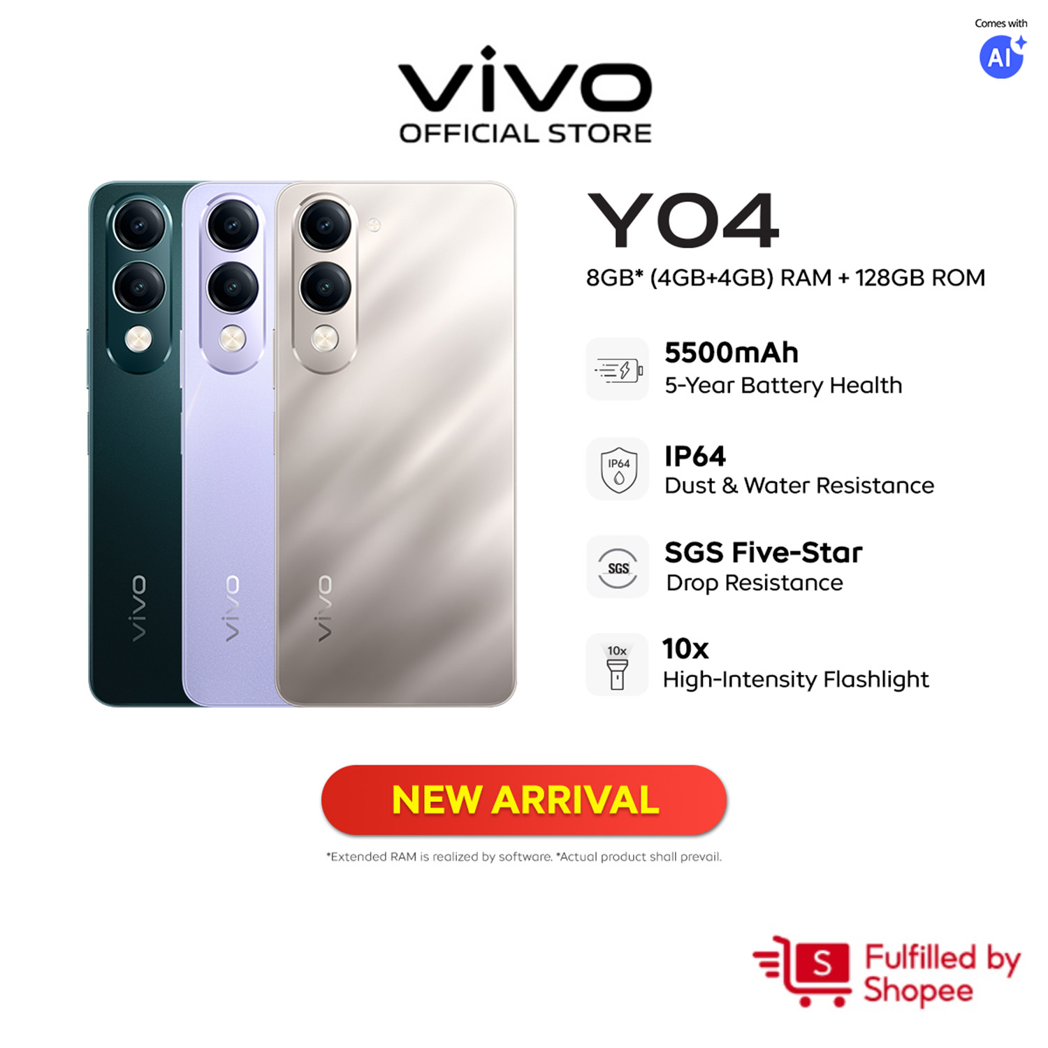 [New] vivo Y04 (4+4)GB+128GB | 5500 mAh (5-Year Battery Health), SGS Five-Star drop resistance,P64,10x