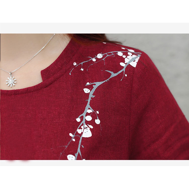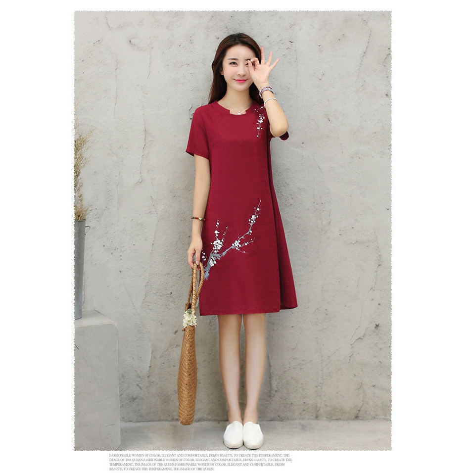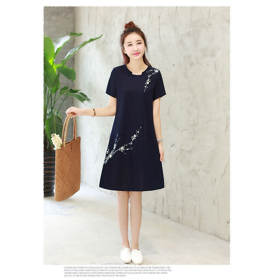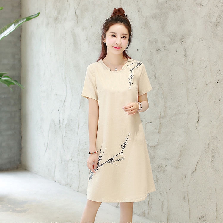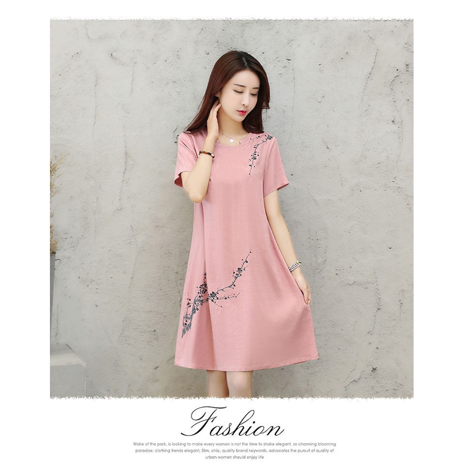 New women short sleeve dress skirt plum blossom pattern dress women large size loose casual A-shaped skirt