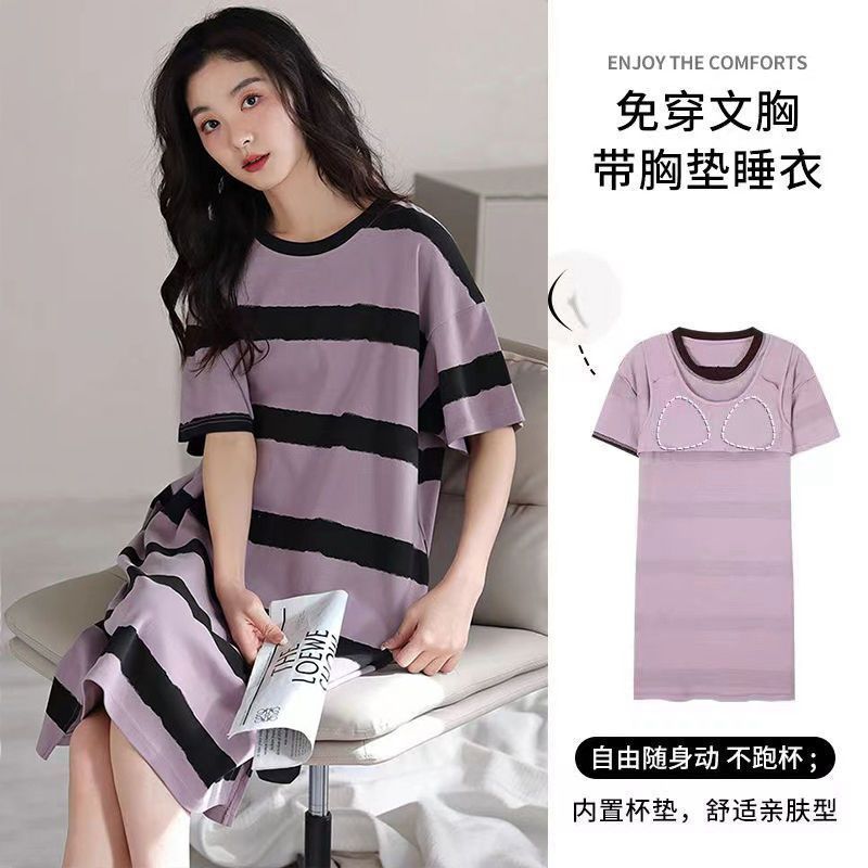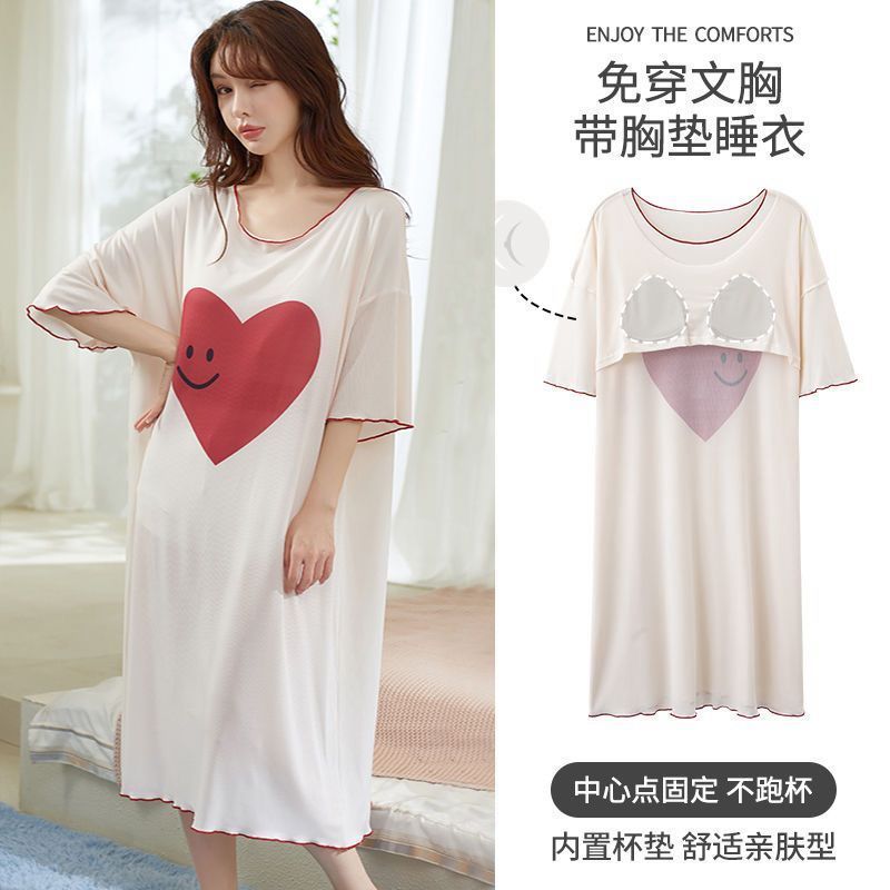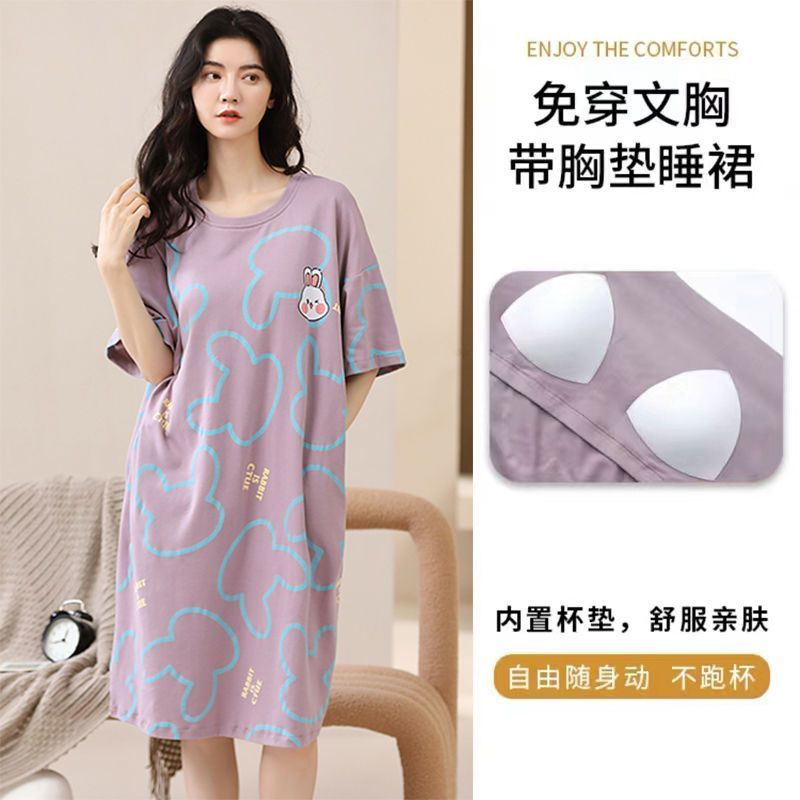 Nightgown for women, plus size, loose, short-sleeved, padded pajamas, thin dress睡裙女士年加大码宽松短袖自带胸垫睡衣薄款连衣裙
