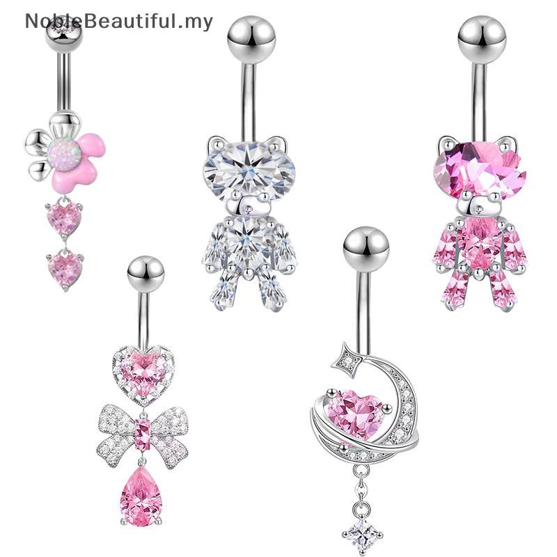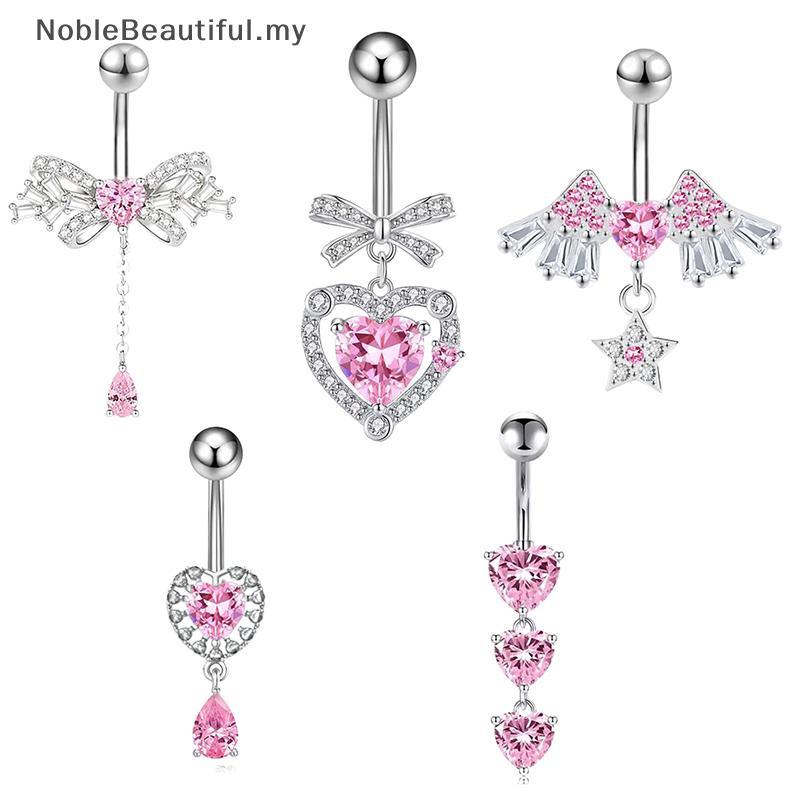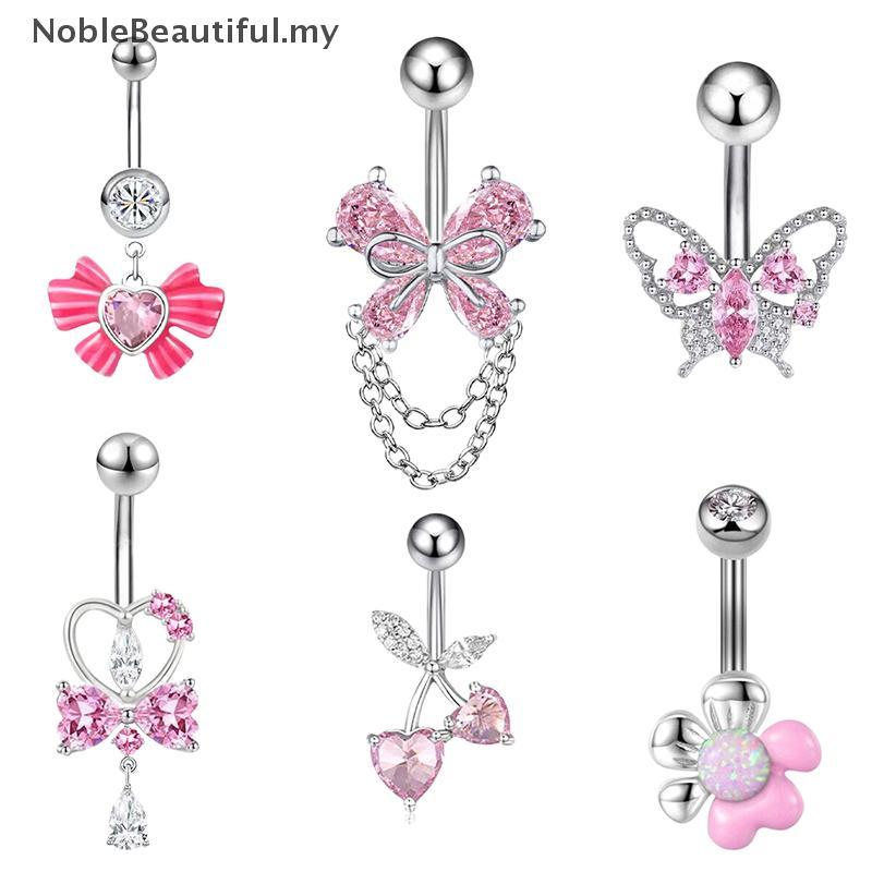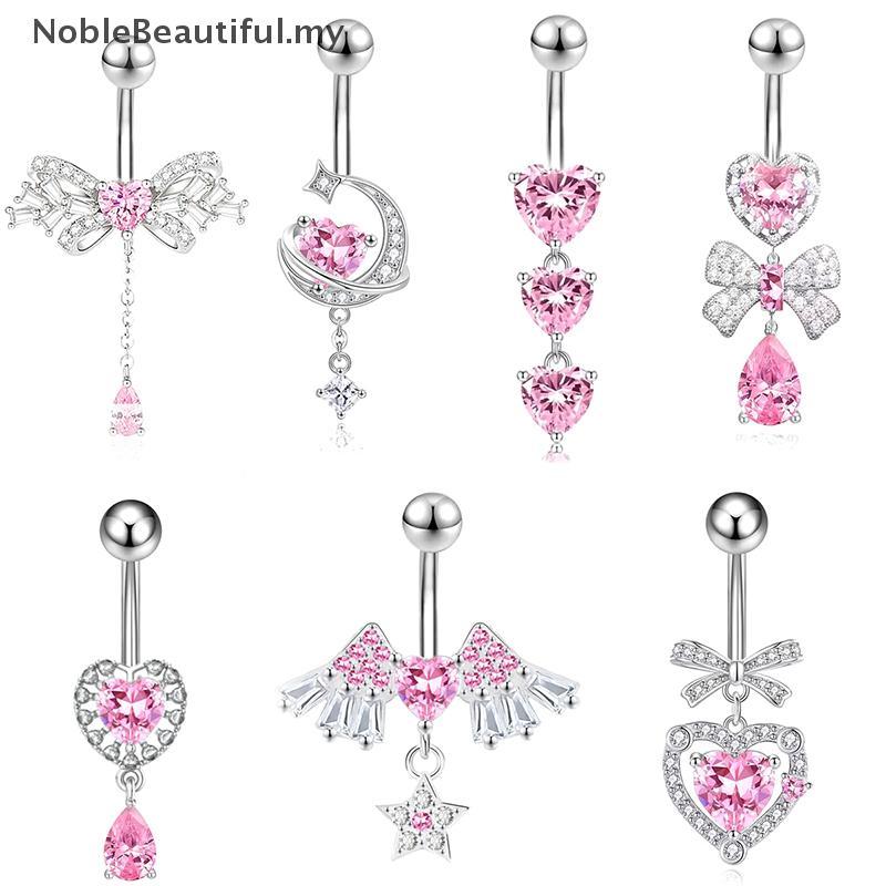 [NobleBeautiful] Pink Zircon Belly Button Rings Stainless Steel Heart Butterfly Navel Piercing Barbell For Women Beach Belly Ring Body Jewelry [MY]