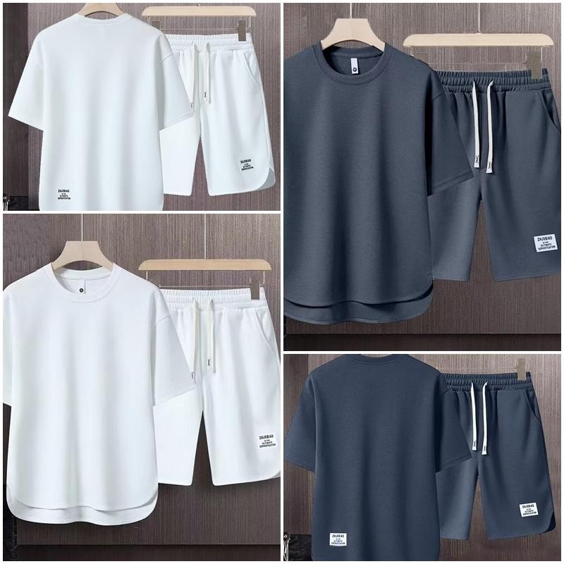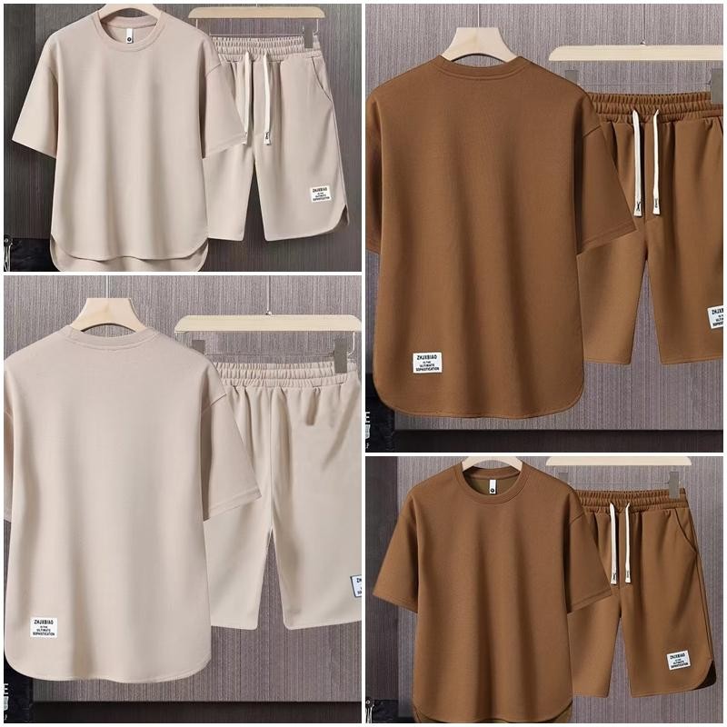 【One Set】Summer Korean style Waffle Fashionable men's sports label Set Plain Apricot Top Couple Casual loose Suit simple Baju-T Lelaki