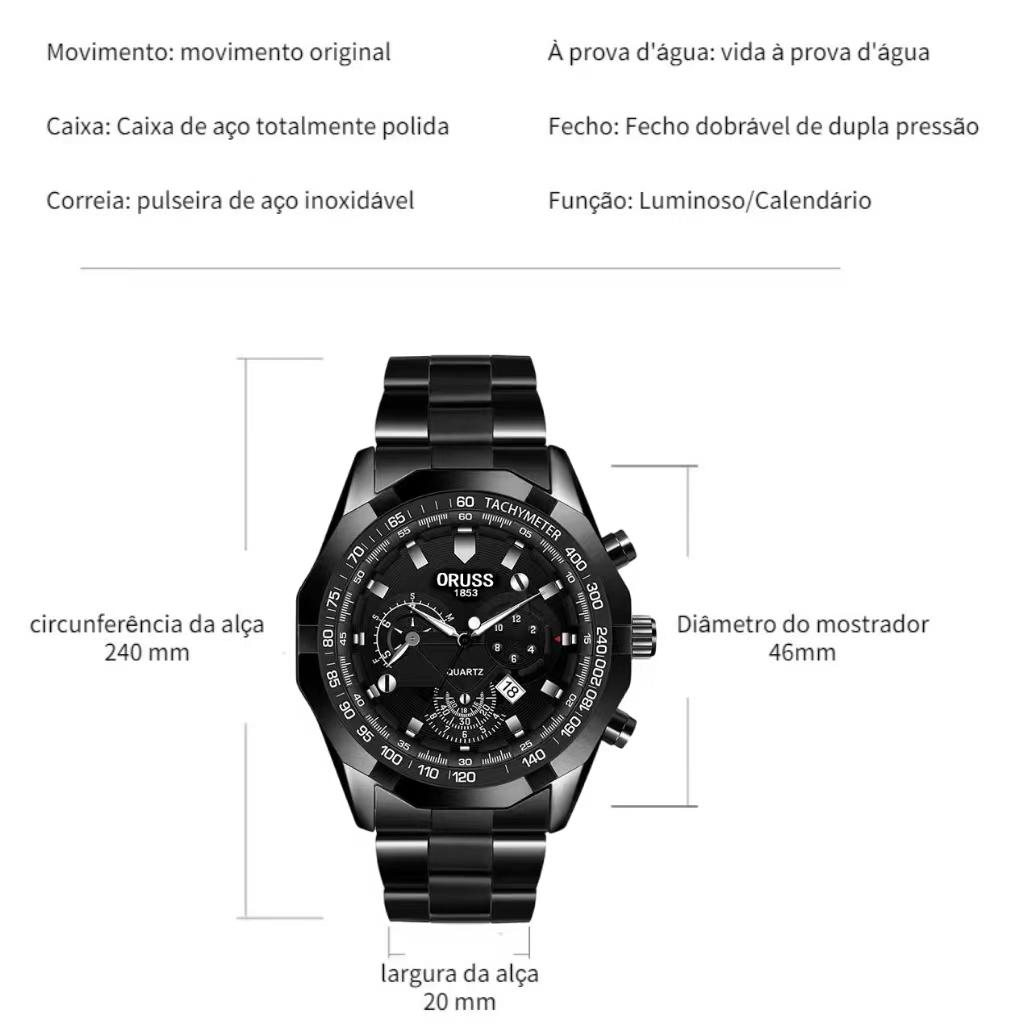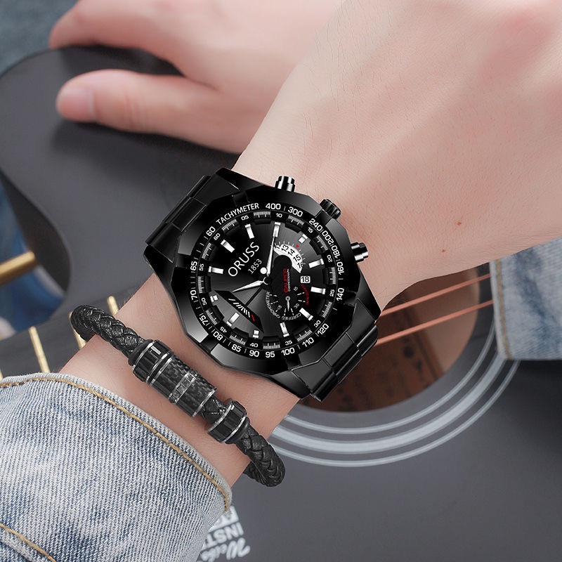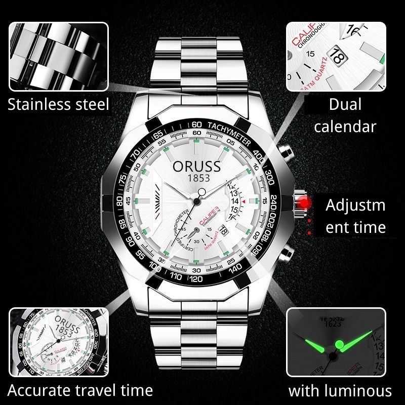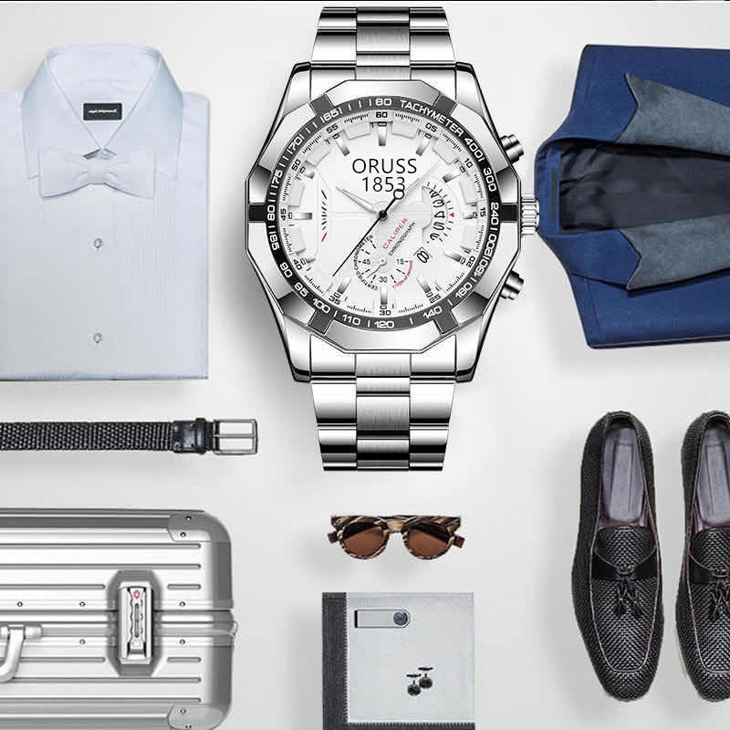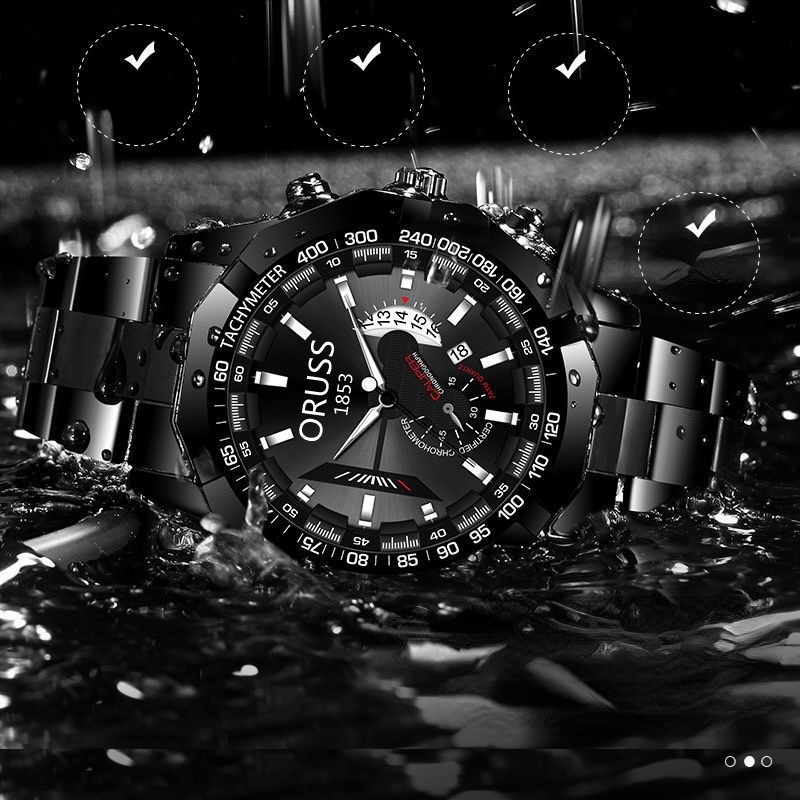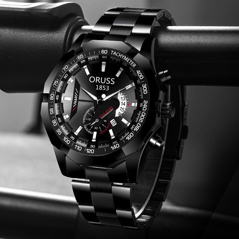ORUSS 1853 Original Men Stainless Steel Date Waterproof Luxury Business Sport Big Watch Men Analog Korean Black Automatic Quartz Wrist Watch For Men Jam Tangan Lelaki
