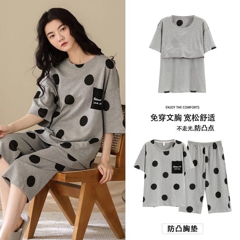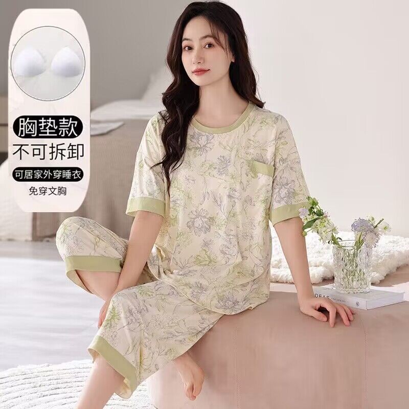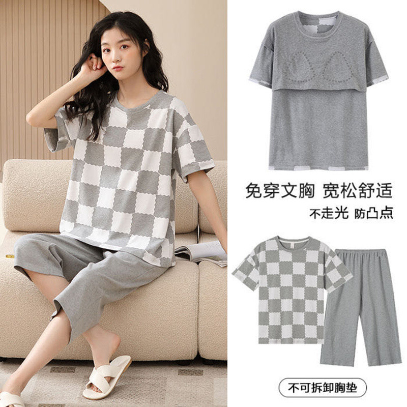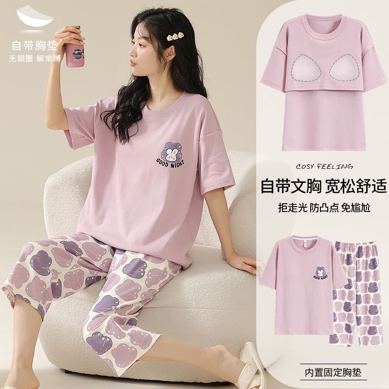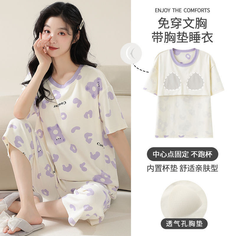 Pajamas Set - Hello Kitty Print, Summer Short Sleeve Crop Pant with Chest Pads, Plus Size Loose Fit Lounge Wear