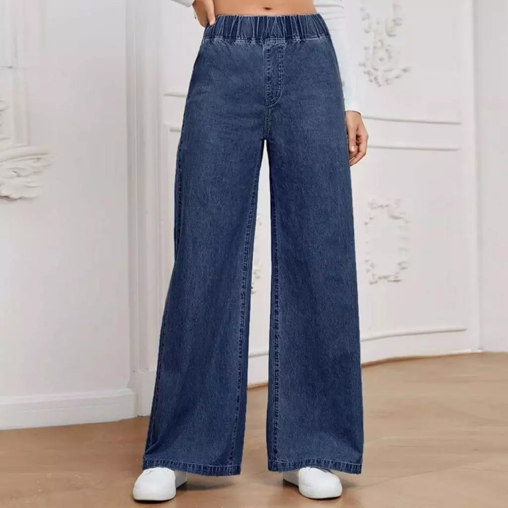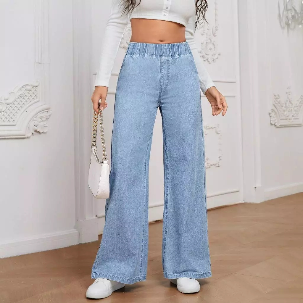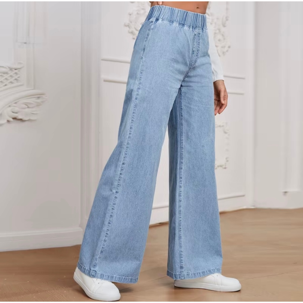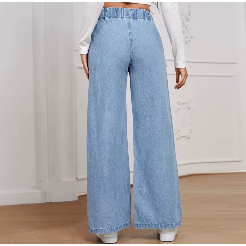 Palazzo JEANS Korean style Women Elastic Waistband Casual Plus Size S-3XL Denim Pants Wanita Solid Color Celana Baggy Je