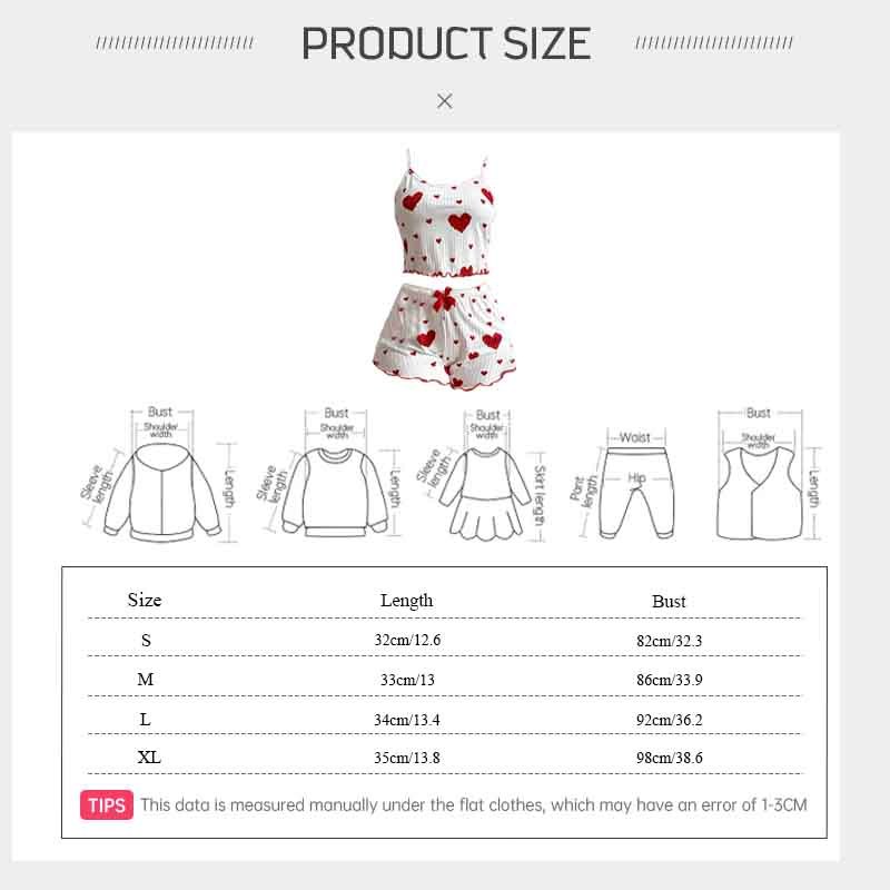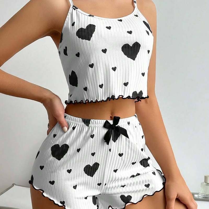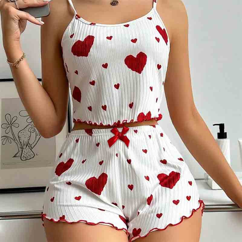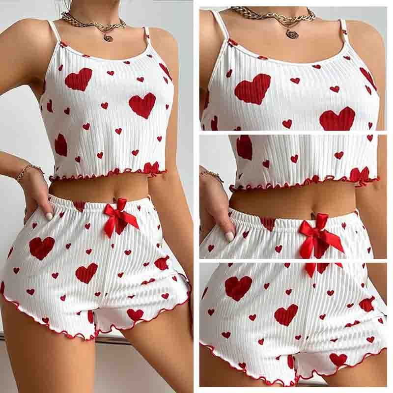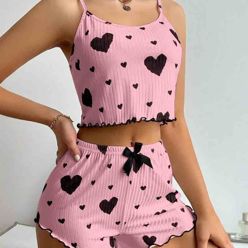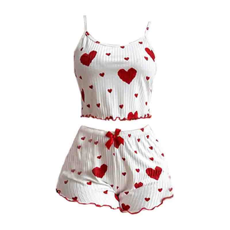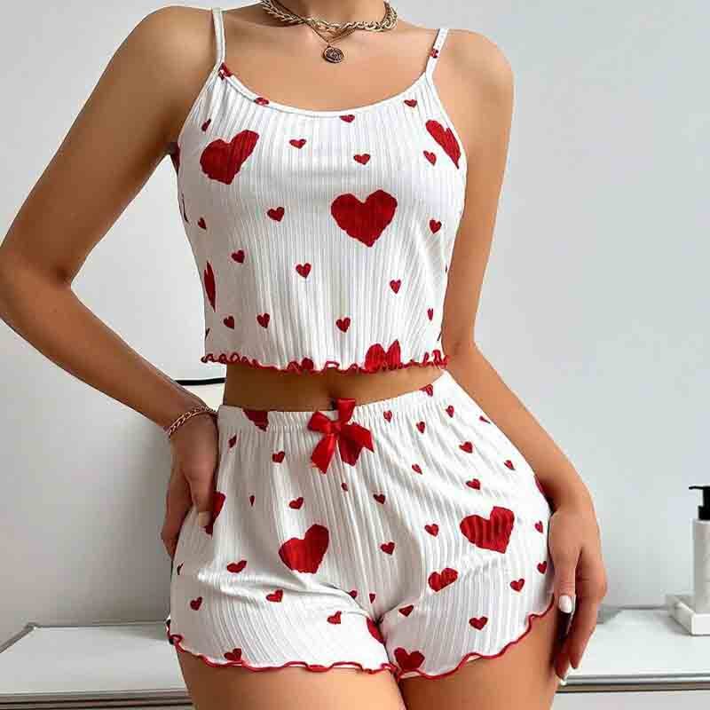 Pit Striped Heart Printed Pajamas Sweet Camisole Shorts 2-piece Set Sexy Pajamas Women GA