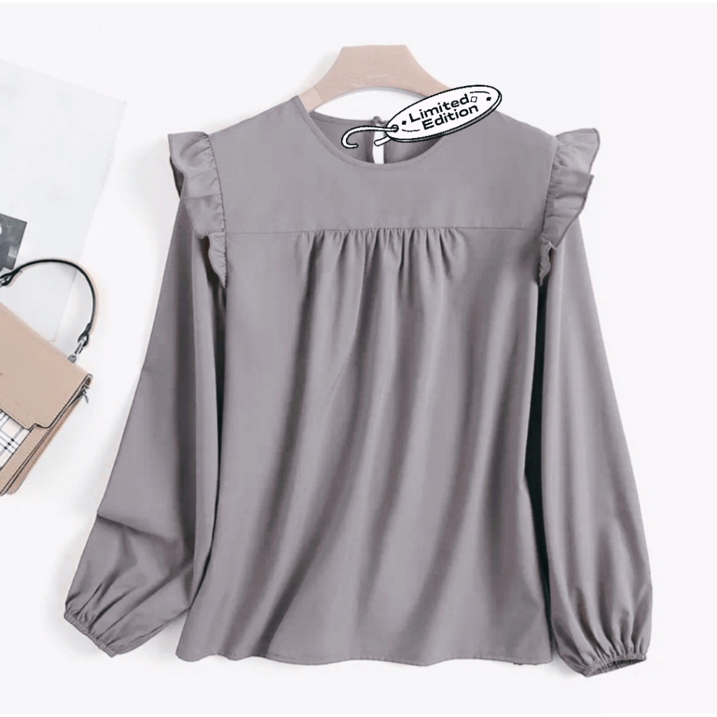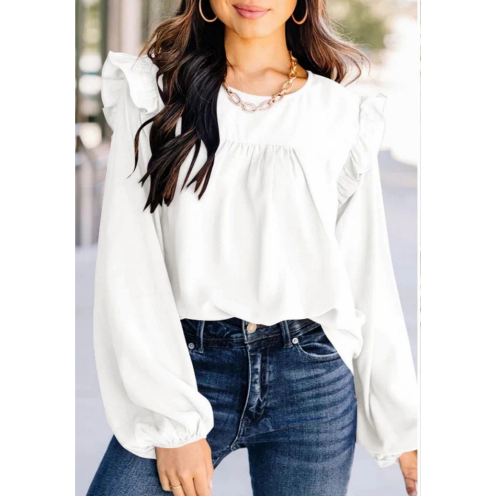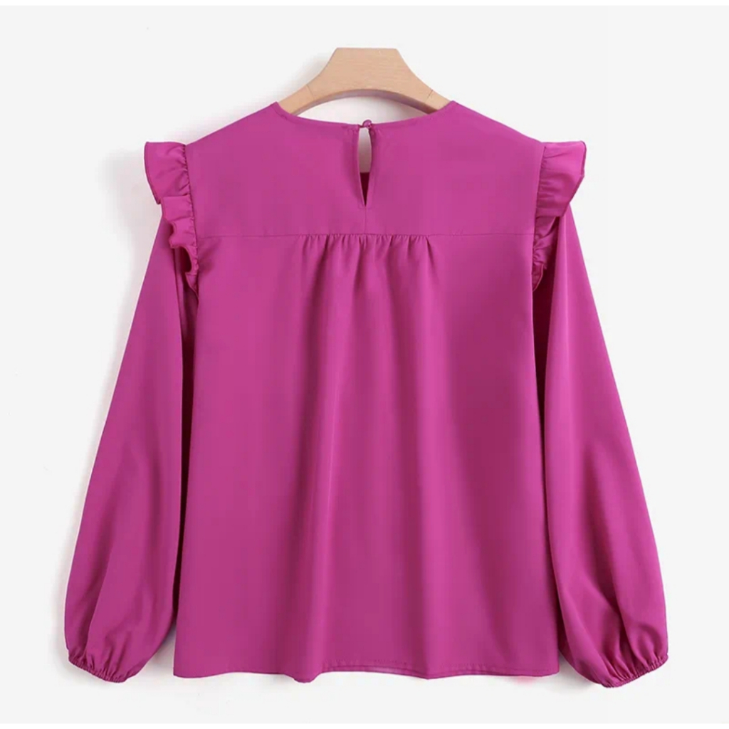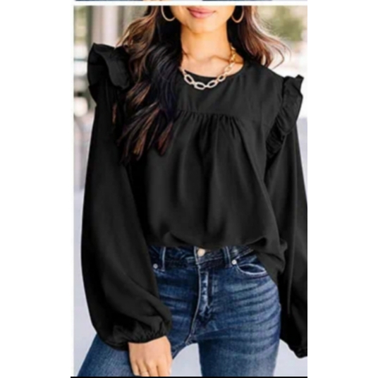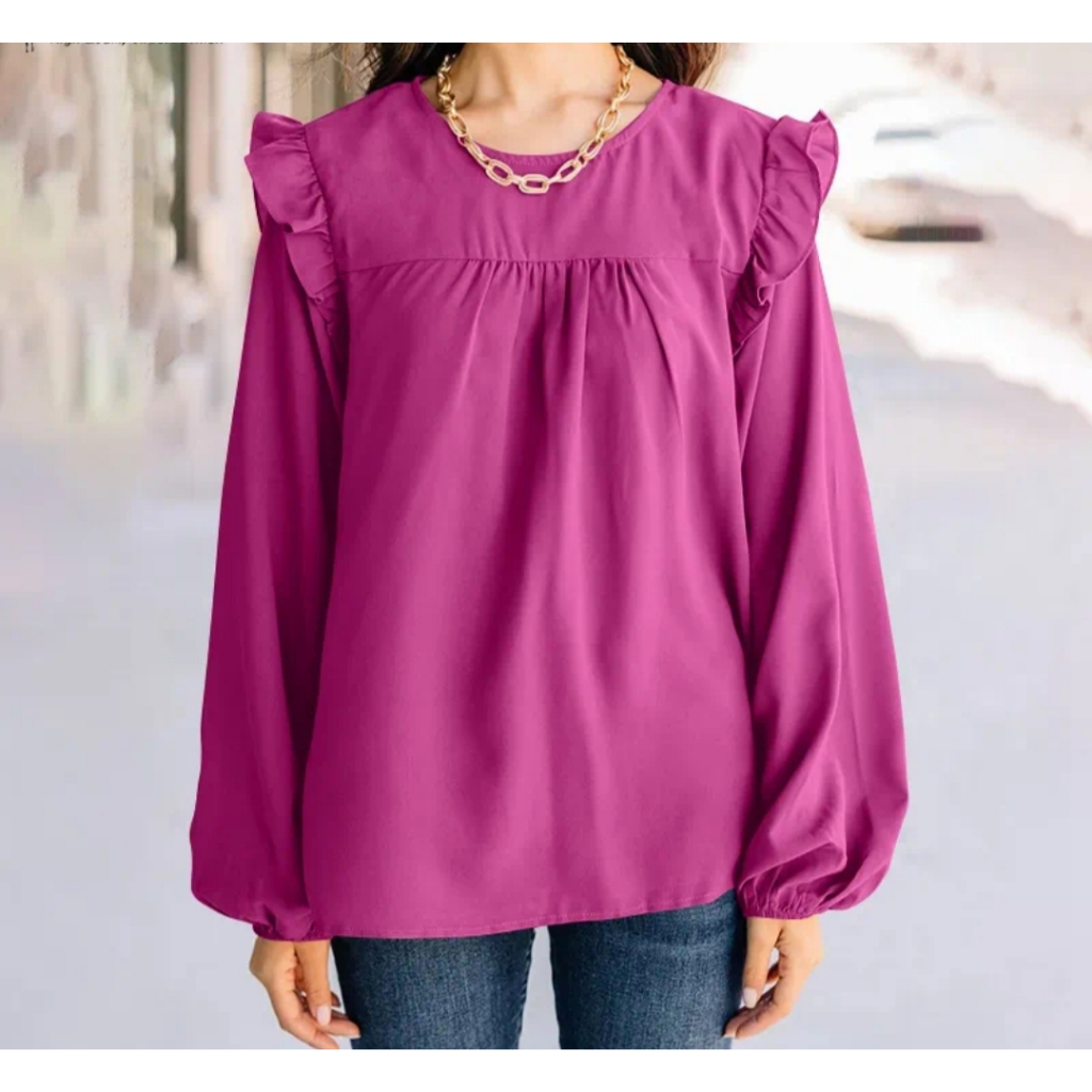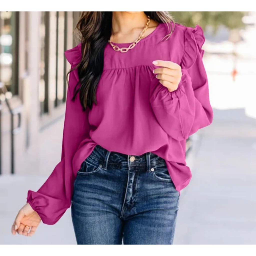 Plus Size Womens Ruffles Long Sleeve Top Blouse, Casual Holiday Party Solid Top Plus Size
