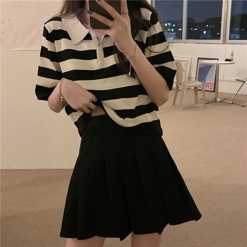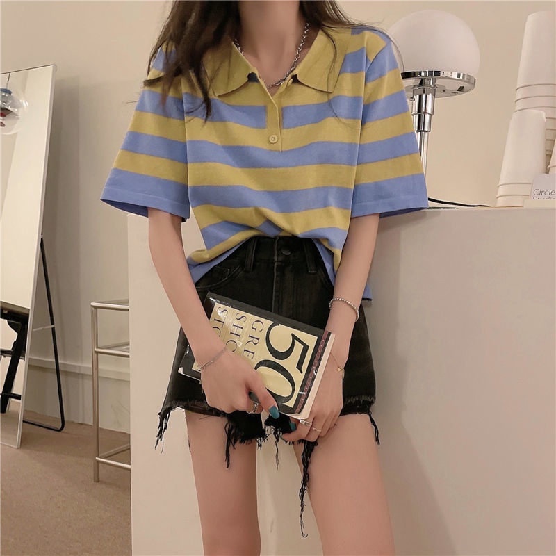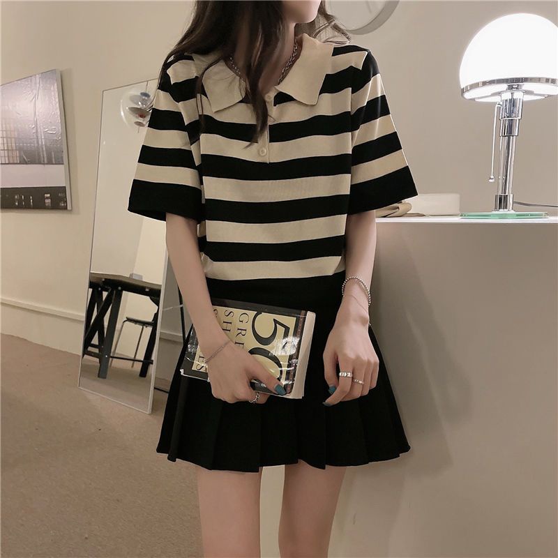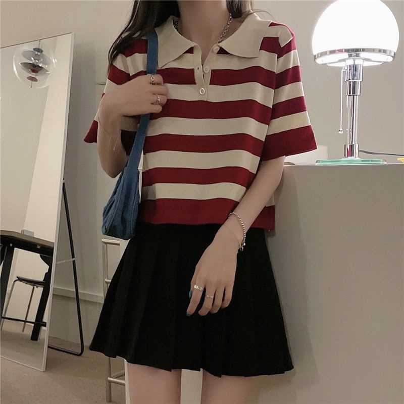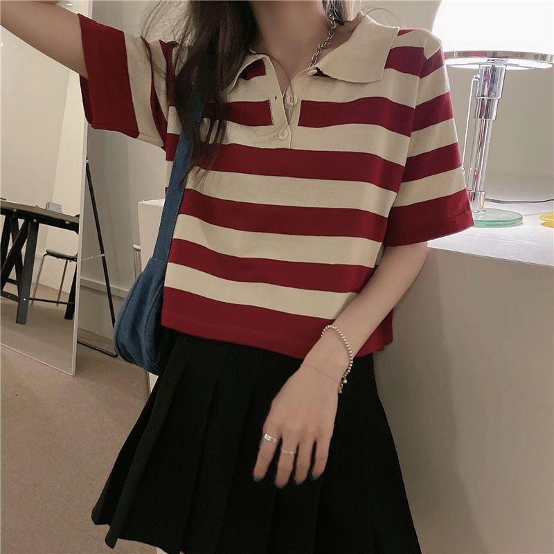 polo领短袖t恤女夏季宽松设计感短款正肩条纹针织上衣Polo collar short sleeve t-shiziyilin.my11.7