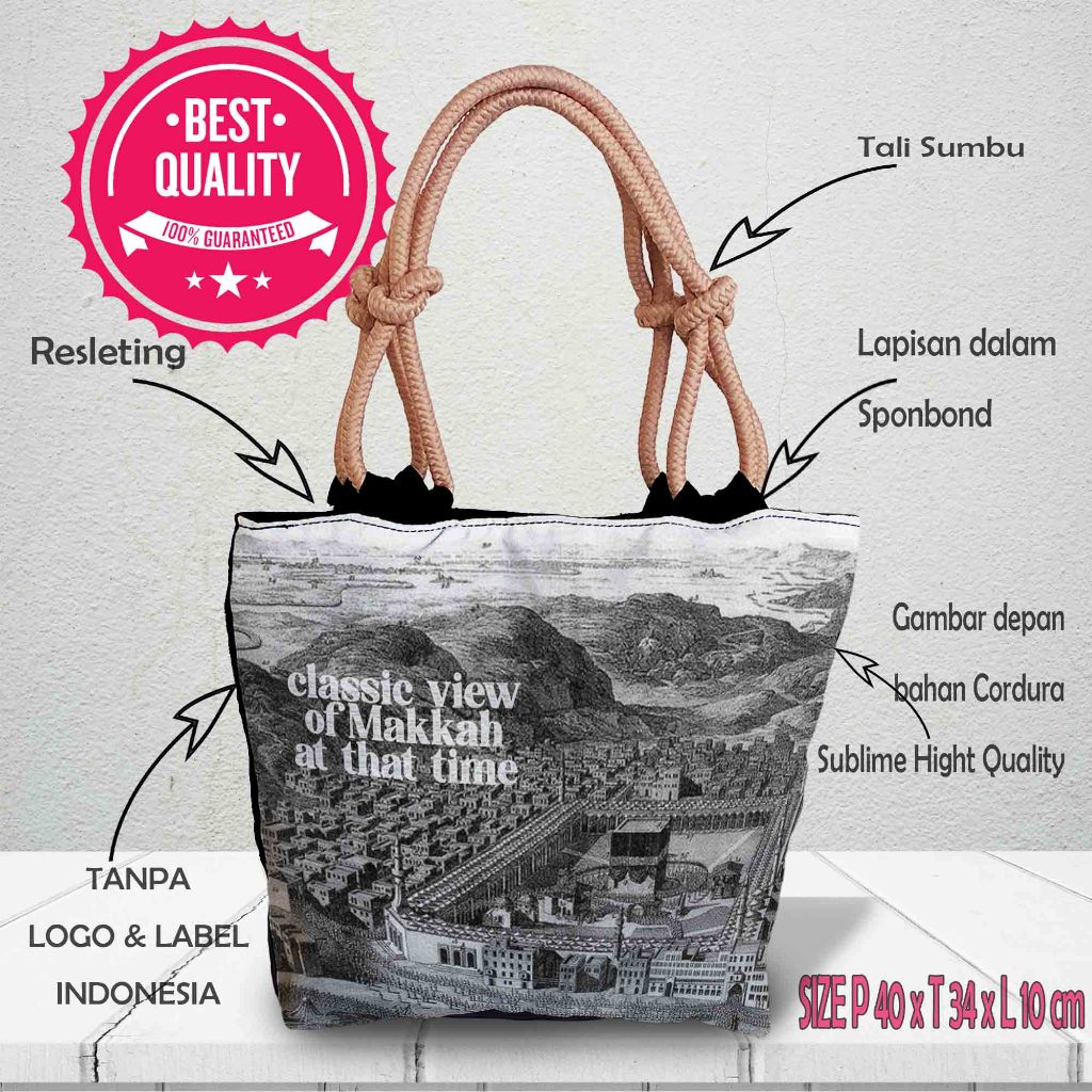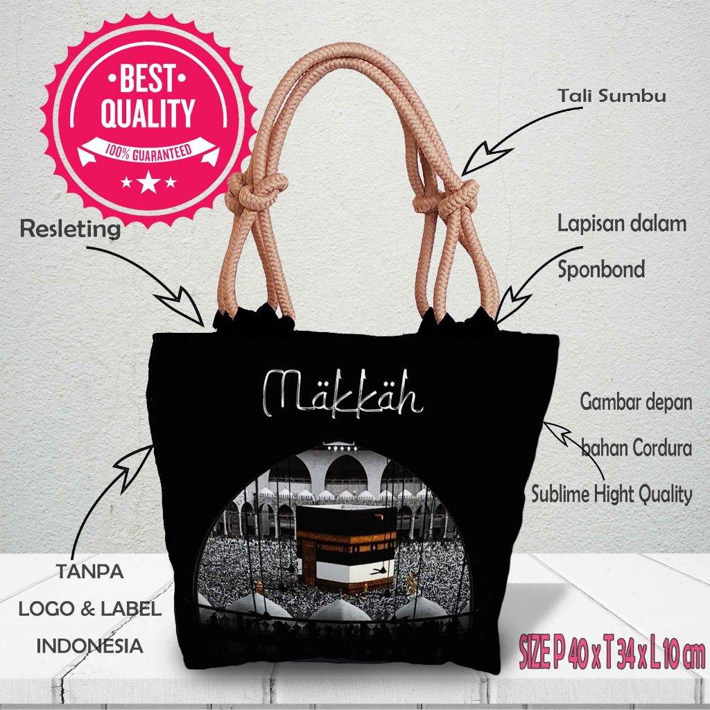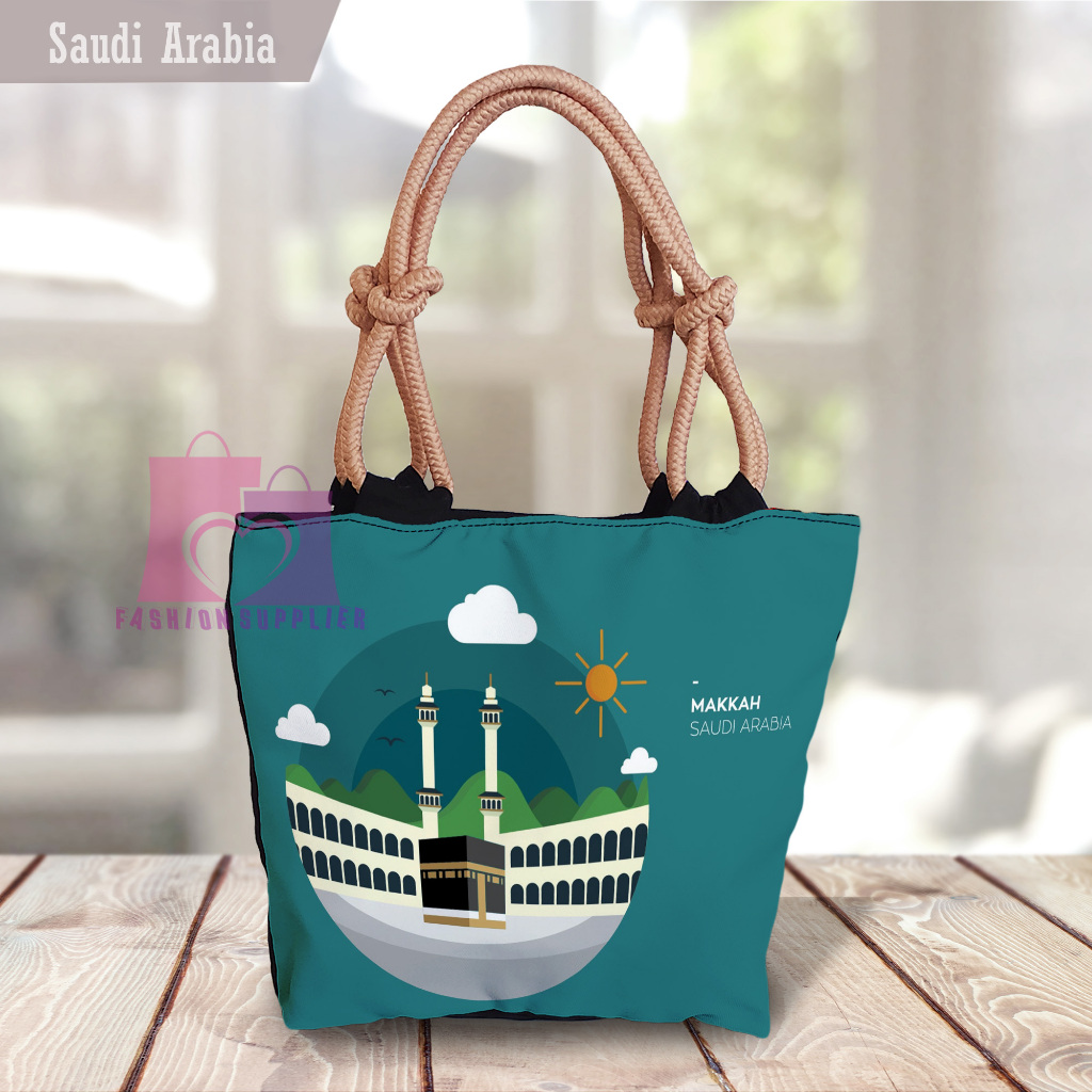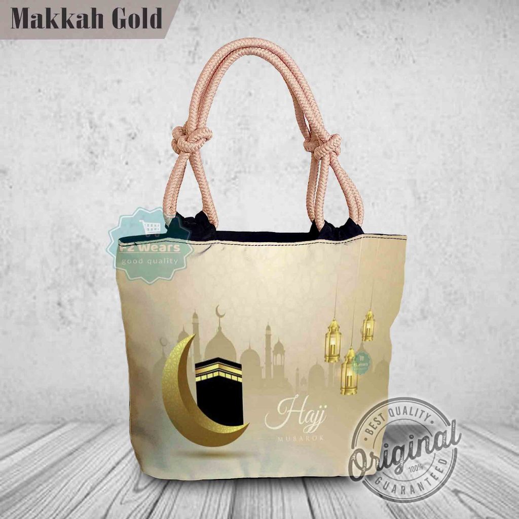[QuinsiBags] Totebag with Wick Rope, Islamic Arabic Motif Printing Souvenir, Umrah, Hajj, Mecca, Kaaba, Medina, Nabawi